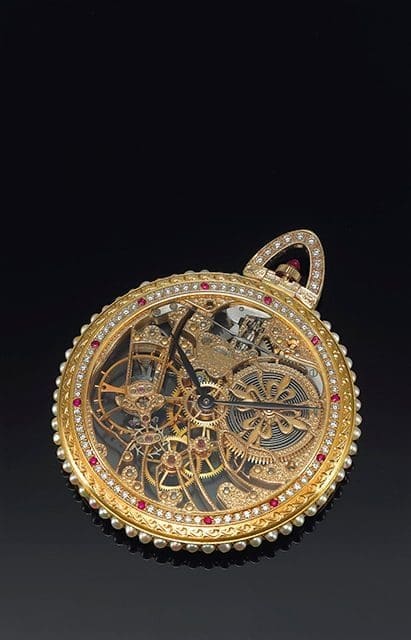 This is one of the rarest and most desirable of all Patek Philippe’s skeletonized watches. Stunningly proportioned and supremely elegant, this reference 912 is one of only five examples known publicly. A true masterpiece of both the watchmakers and jewellers art, the impressive 48 mm diameter case is set with diamonds and pearls, yet at the same time, it is incredibly thin. The entirely visible movement has been fully skeletonized and richly hand-engraved, to add to its delicacy and sophistication, it displays five-spoke wheels, and the Patek Philippe ‘Calatrava’ emblem forms the spring barrel casing. Undoubtedly one of the most precious and richly decorated of Patek Philippe’s ‘Haute Joaillerie’ timepieces, this watch will impress even the most exacting and discerning of collectors.