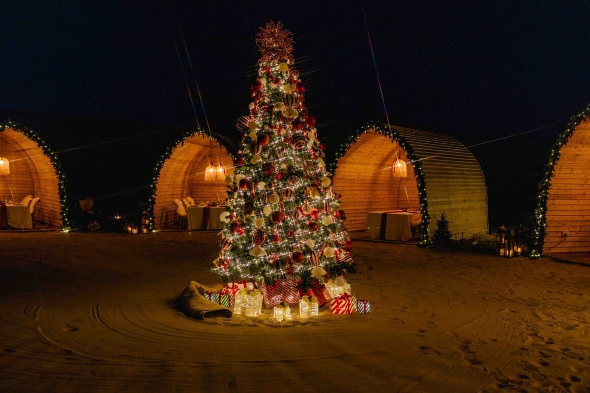 Located amidst the serene rolling dunes of Dubai, The Winter Nest brings the spirit of the Alps to the desert. The venue features eight private chalets arranged around a central Christmas tree, illuminated by twinkling lights and adorned with festive decorations, all set against the tranquil desert backdrop. This unique setting creates the perfect ambiance for an unforgettable dining experience, bringing the charm of an alpine retreat to the heart of the desert.