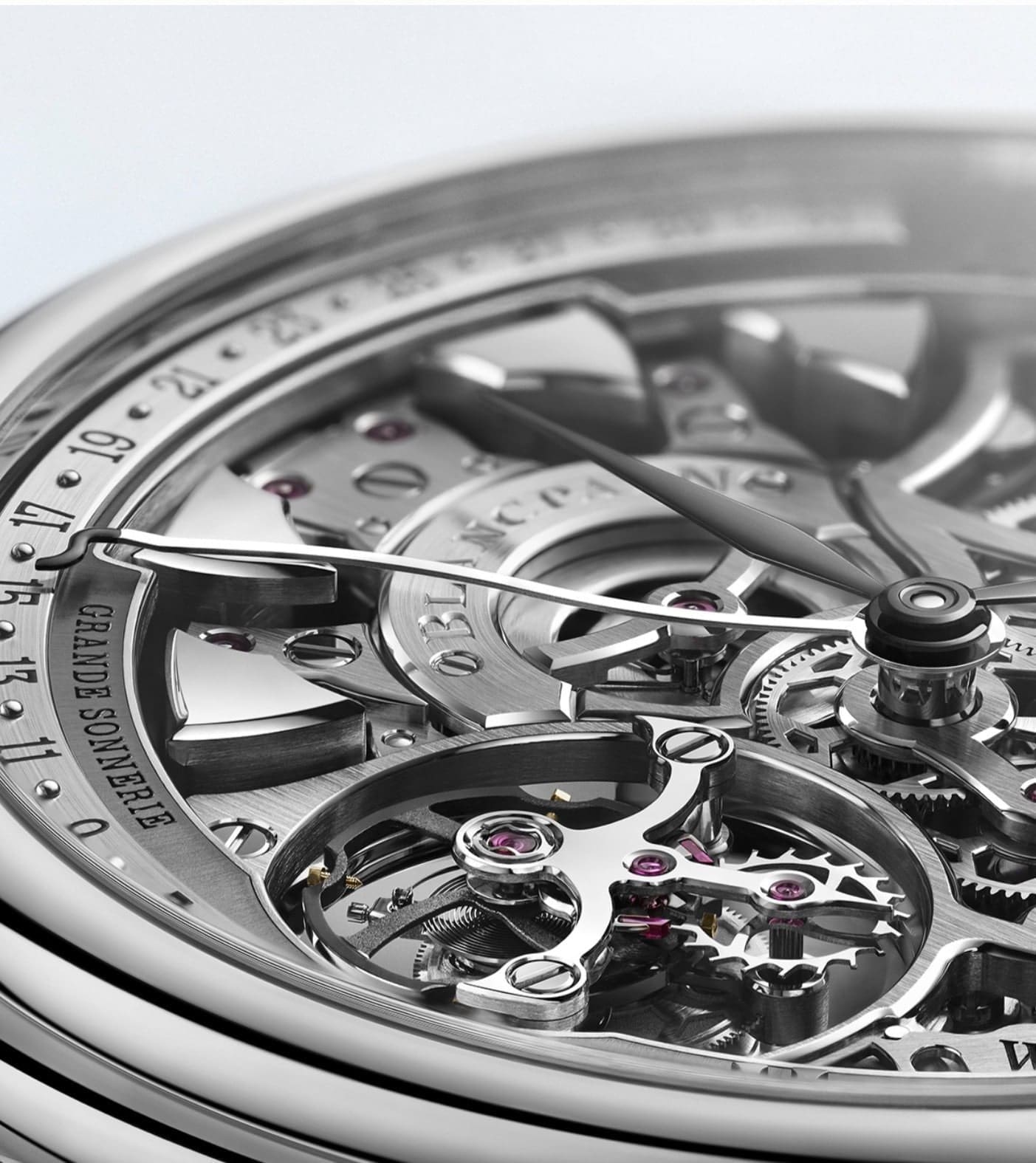 This exceptional advancement is supported by an entirely integrated construction housing more than 1,000 components and 13 patents, culminating in the most complicated watch Blancpain has ever produced. Within its openworked architecture, the Grande Double Sonnerie reveals a sophisticated mechanical symphony: a grande sonnerie, petite sonnerie, minute repeater, a redesigned retrograde perpetual calendar, and the Maison’s celebrated flying tourbillon elevated to 4 Hz for enhanced chronometric performance. Every complication is harmonized into a single movement, preserving both aesthetic transparency and mechanical unity.