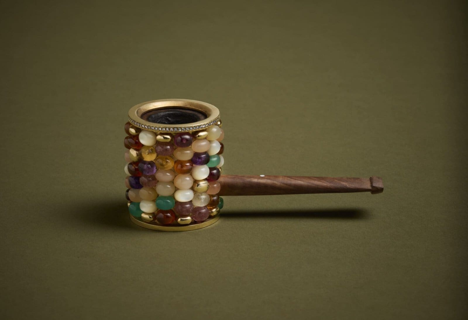 Drawing inspiration from 19th-century American corn cob pipes, dunhill’s refined interpretation takes the rustic form into the realm of the extraordinary. The carved bowl is encased in an 18-carat gold frame, its surface adorned with meticulously set semi-precious stones that glint like gilded corn kernels. It’s a tactile homage to the past, reimagined with elegance and wit, and crafted by hand through the combined expertise of a master pipe maker and jewellery stone setter from The White Spot—dunhill’s storied pipe-making division.