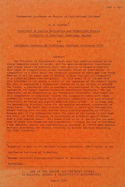 When the thesis was written in October 1965, Hawking was already suffering from the early symptoms of amyotrophic lateral sclerosis (ALS,) and it was his wife Jane, whom he had married three months earlier, who typed out the 117 pages of the document, painstakingly adding the mathematical equations by hand. The thesis is signed in Hawking’s distinctively shaky handwriting, with the statement: “This dissertation is my original work. S.W. Hawking.”