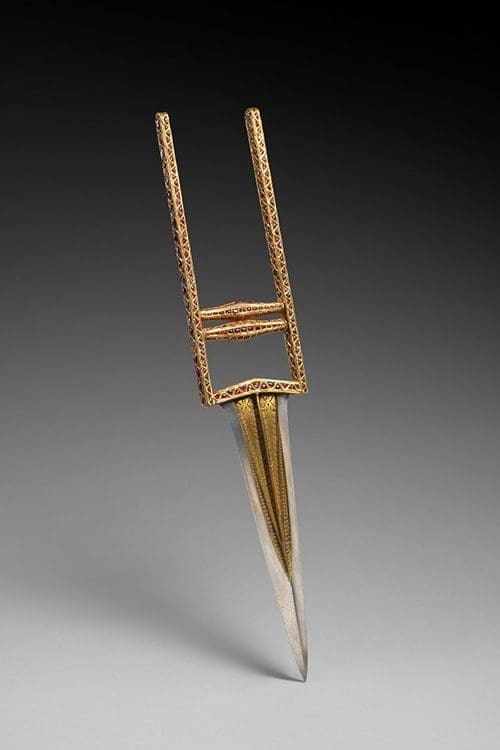 - a jewelled katar dagger from India (18th CE) inlayed with 481 rubies and almost one hundred emeralds, a weapon worn at court as a symbol of wealth and power