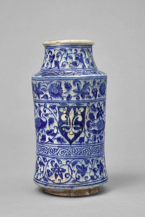 - a rare Albarello decorated with fleurs-de-lys from Syria or Egypt (14th – 15th CE), used for medicines or perfumes belonging to a group of Syrio-Egyptian ceramics of the Mamluk period influenced by Chinese Yuan dynasty (1268-1644) ceramics