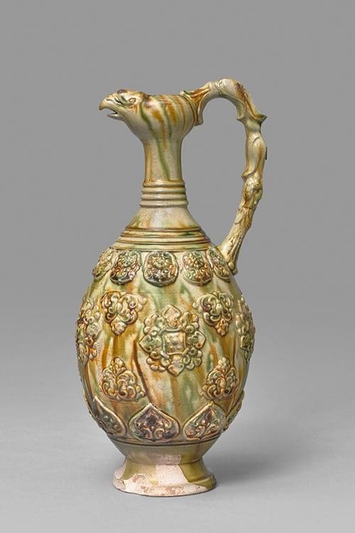 - a Phoenix-headed Ewer from the Tang Dynasty, China (8th CE) in white earthenware with a three-coloured glaze