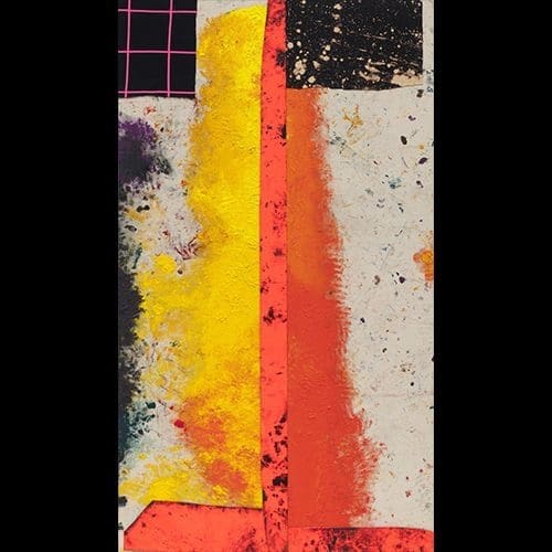 WIDW. HIGH-VIZ. by Sterling Ruby features acrylic, oil, elastic, cardboard and treated fabric on canvas. Executed in 2018, it is estimated to fetch between 250,000 and 350,000 dollars.