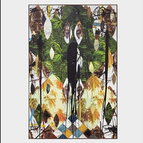 Untitled Escape Collage by Rashid Johnson is constructed using ceramic tile, mirror tile, red oak flooring, vinyl, spray enamel, oil stick, black soap and wax, mounted to board. It was executed in 2018 and signed “Rashid Johnson” on the reverse. It is estimated to fetch between 185,000 and 225,000 dollars.
