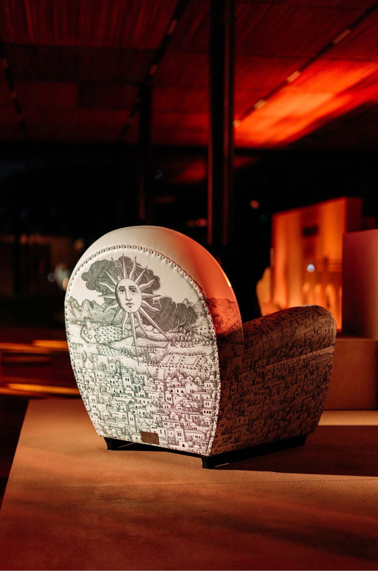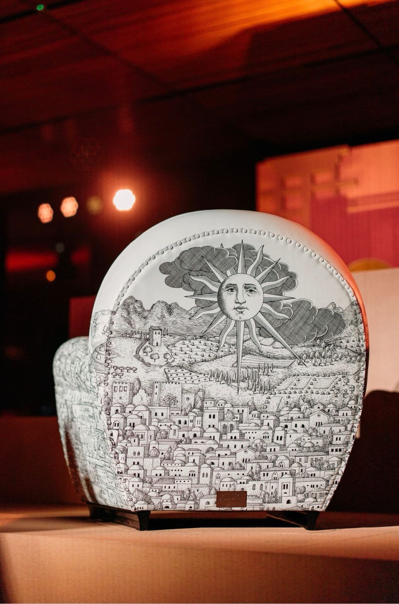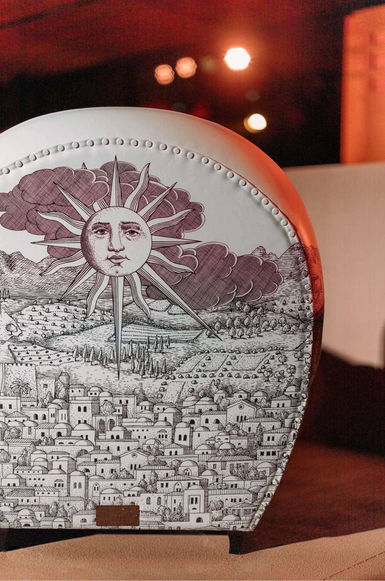 The decoration animating the piece is drawn from the Fornasetti archive. “Mediterranea,” first conceived by Piero Fornasetti in 1949 as wallpaper, depicts a poetic landscape of rooftops, domes and windows. For this exclusive collaboration, Barnaba Fornasetti has enriched the motif with celestial symbols — sun and moon emerging from swirling clouds — marking the beginning and end of Ramadan. A solitary figure drifting skyward in a hot air balloon introduces a note of quiet wonder.