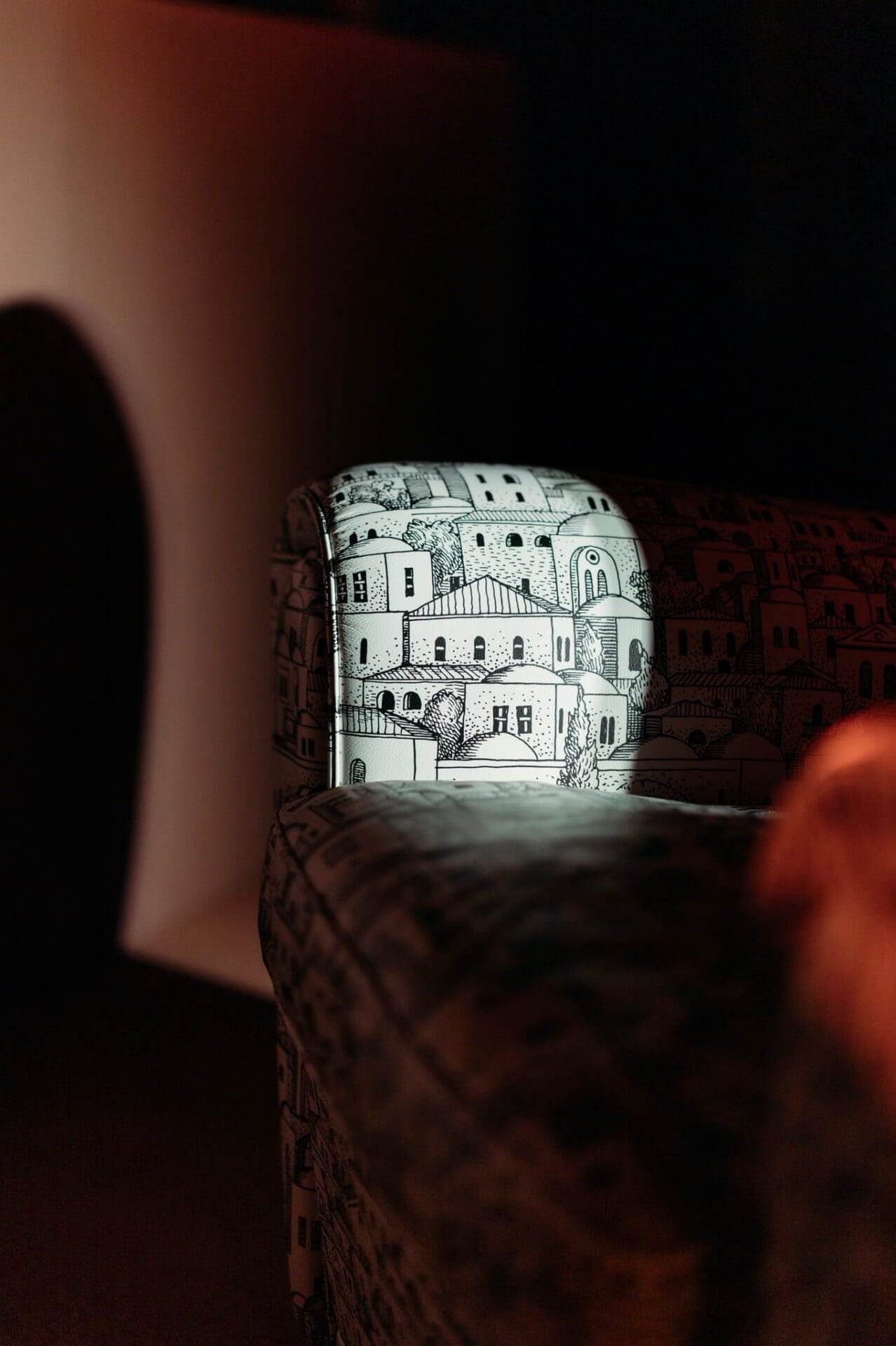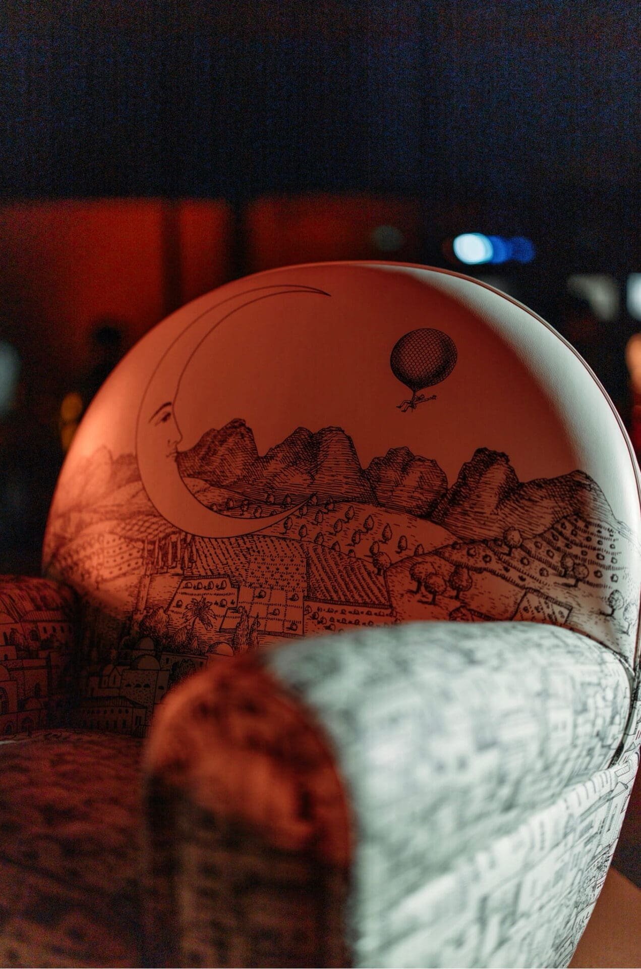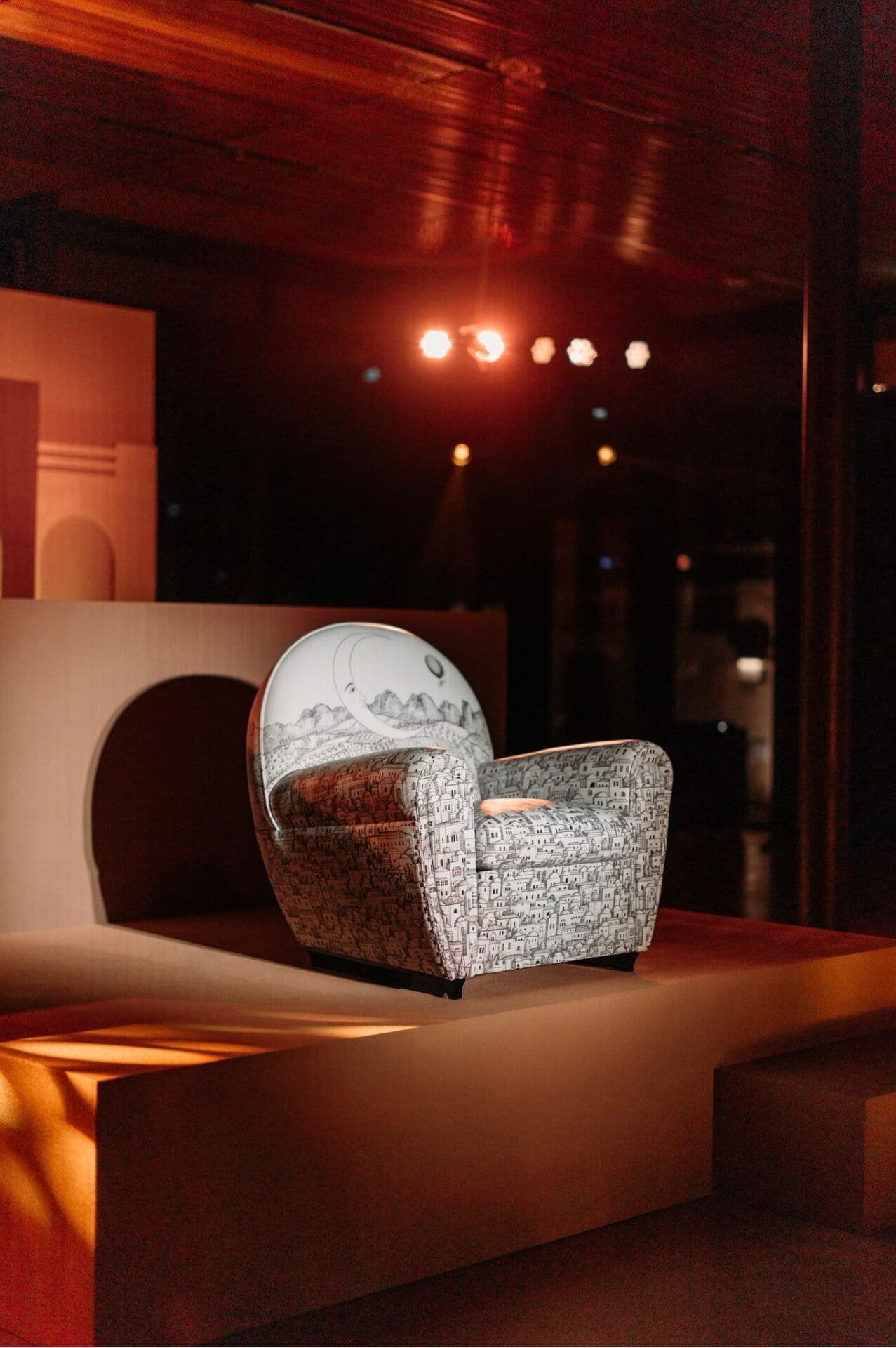 The decoration animating the piece is drawn from the Fornasetti archive. “Mediterranea,” first conceived by Piero Fornasetti in 1949 as wallpaper, depicts a poetic landscape of rooftops, domes and windows. For this exclusive collaboration, Barnaba Fornasetti has enriched the motif with celestial symbols — sun and moon emerging from swirling clouds — marking the beginning and end of Ramadan. A solitary figure drifting skyward in a hot air balloon introduces a note of quiet wonder.
