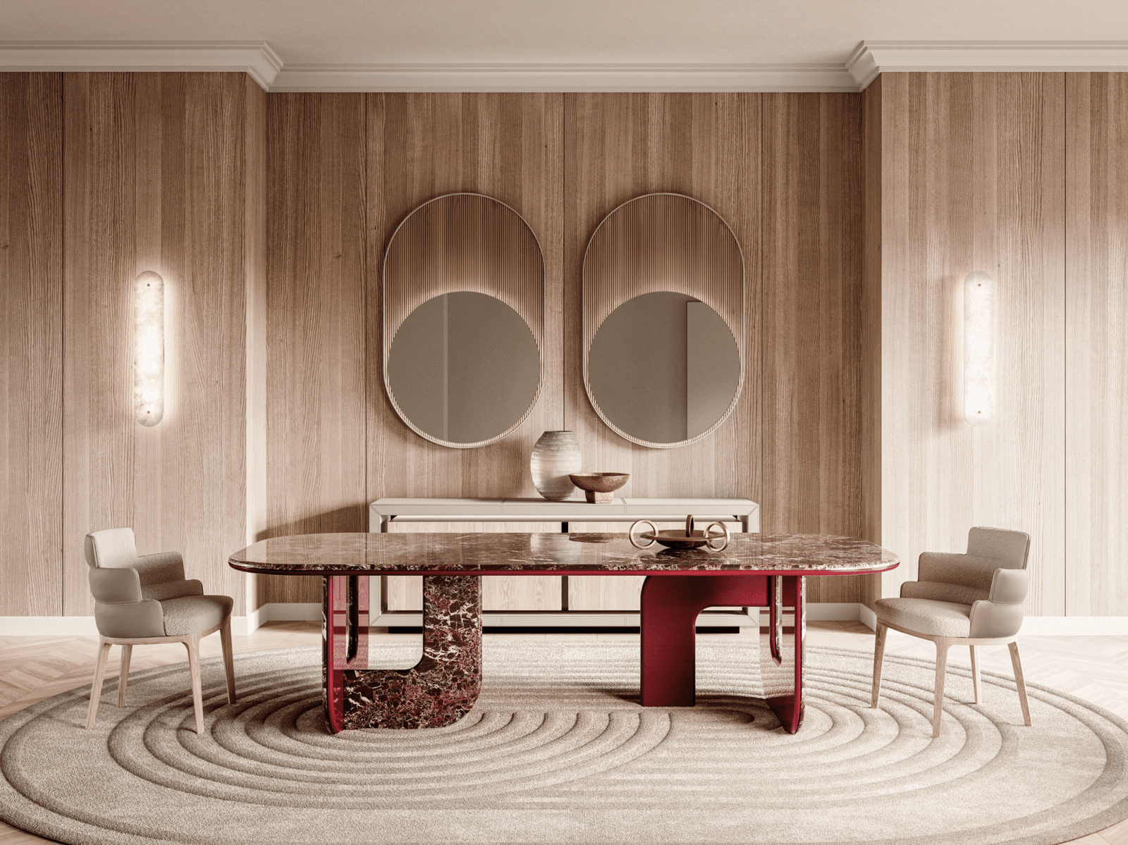 Rich and sophisticated palettes continue to define the year ahead, with ochre, terracotta, oxblood, muted greens and deep neutrals bringing warmth and permanence. These grounded tones gain sophistication when paired with lacquered finishes, refined upholstery and subtle material contrasts. The result is an atmosphere that feels confident, intimate, and enduring rather than trend-driven.