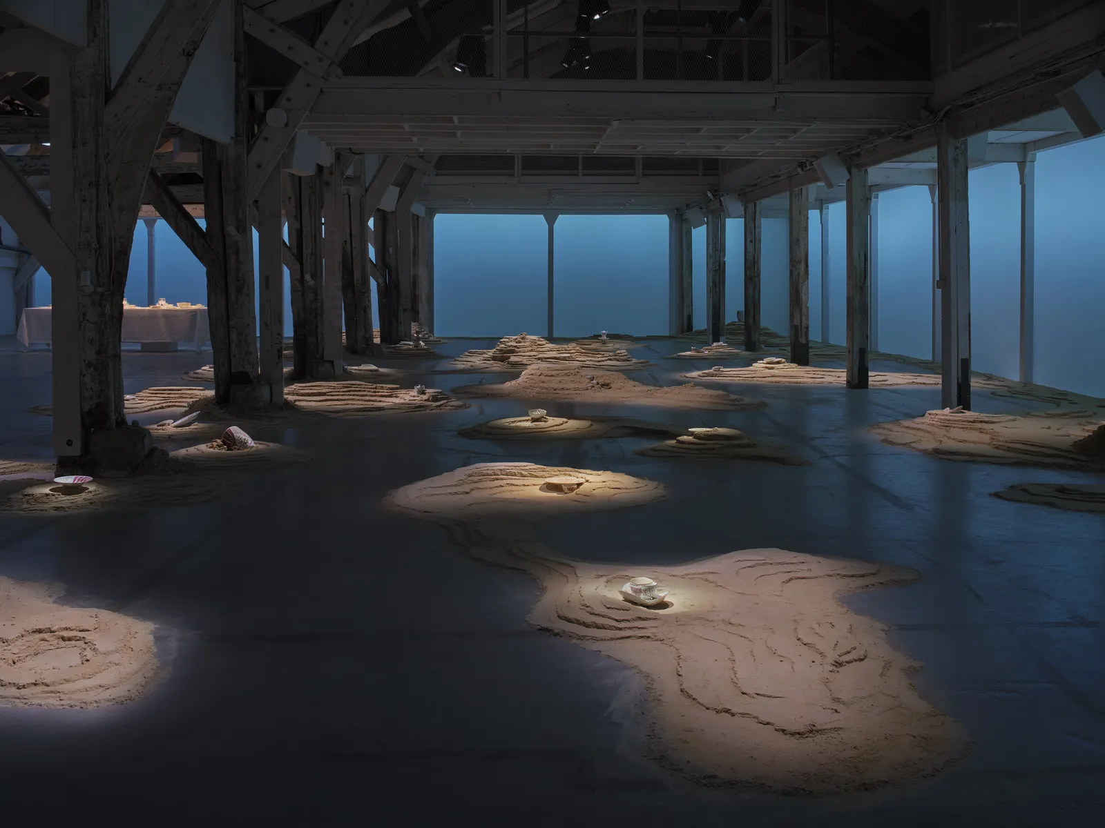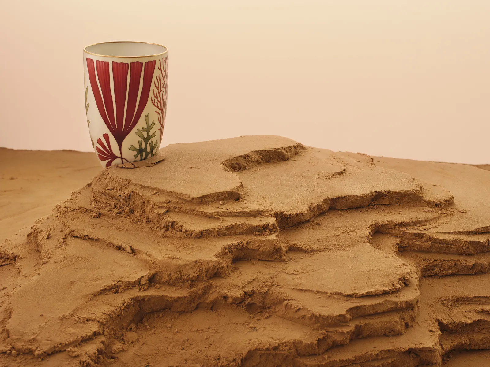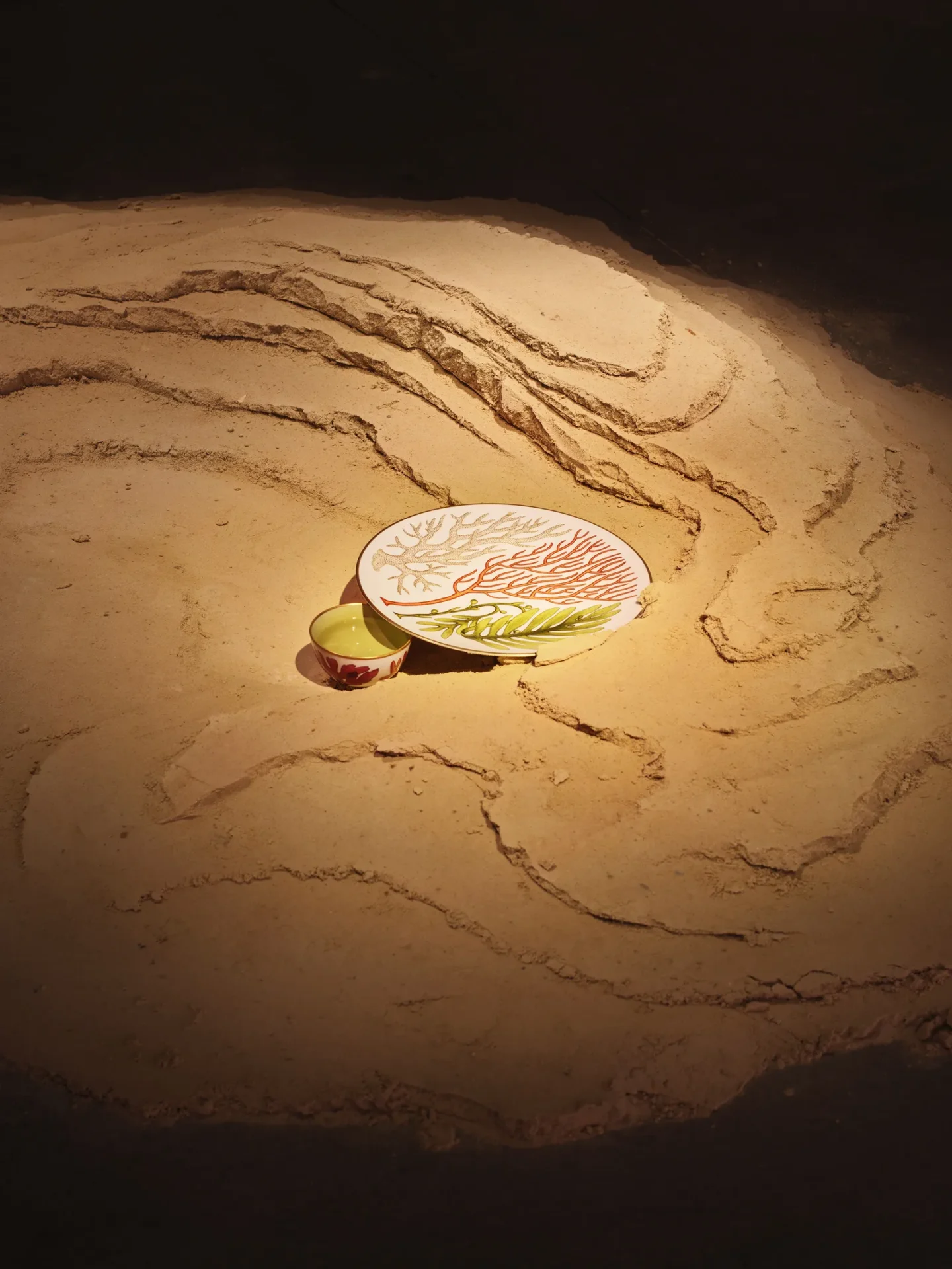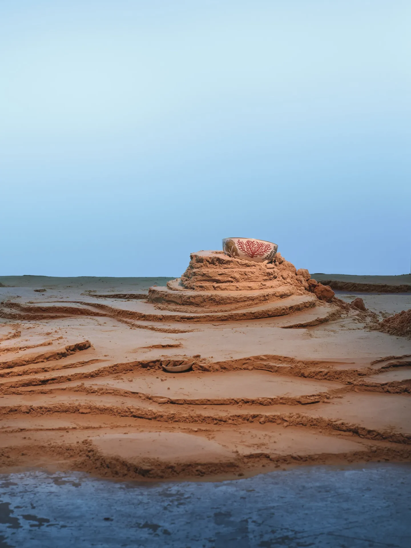 During its presentation at Paris Design Week, the collection was staged inside an old carpentry workshop on a tidal landscape of sand. Plates were partially buried, and bowls were half-revealed, as if the tide had just gone out to leave these porcelain treasures behind. It’s a collection that rejects the “performance” of traditional luxury in favor of something much more grounded—literally.
