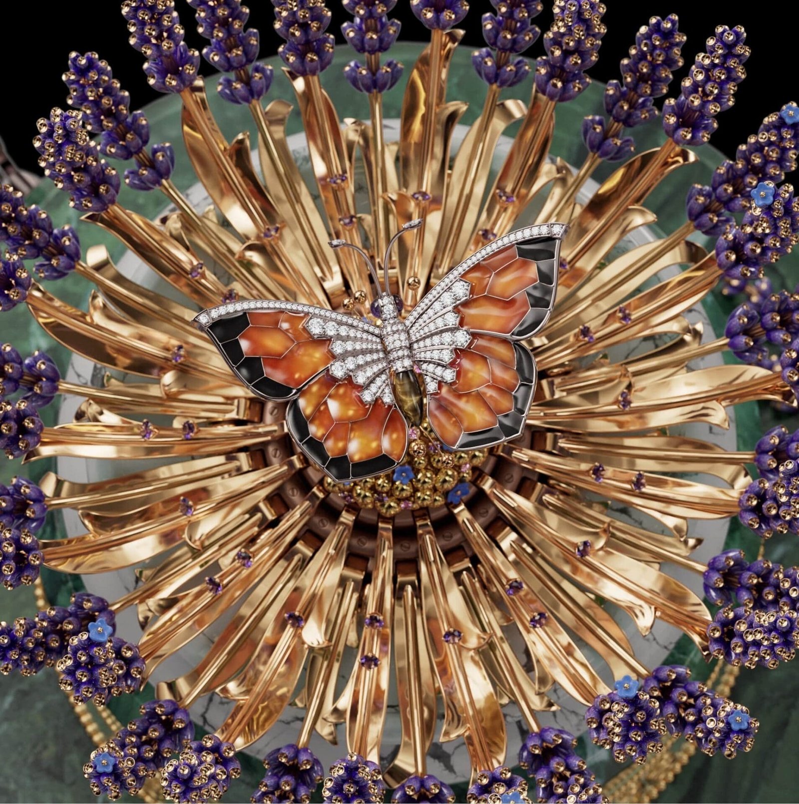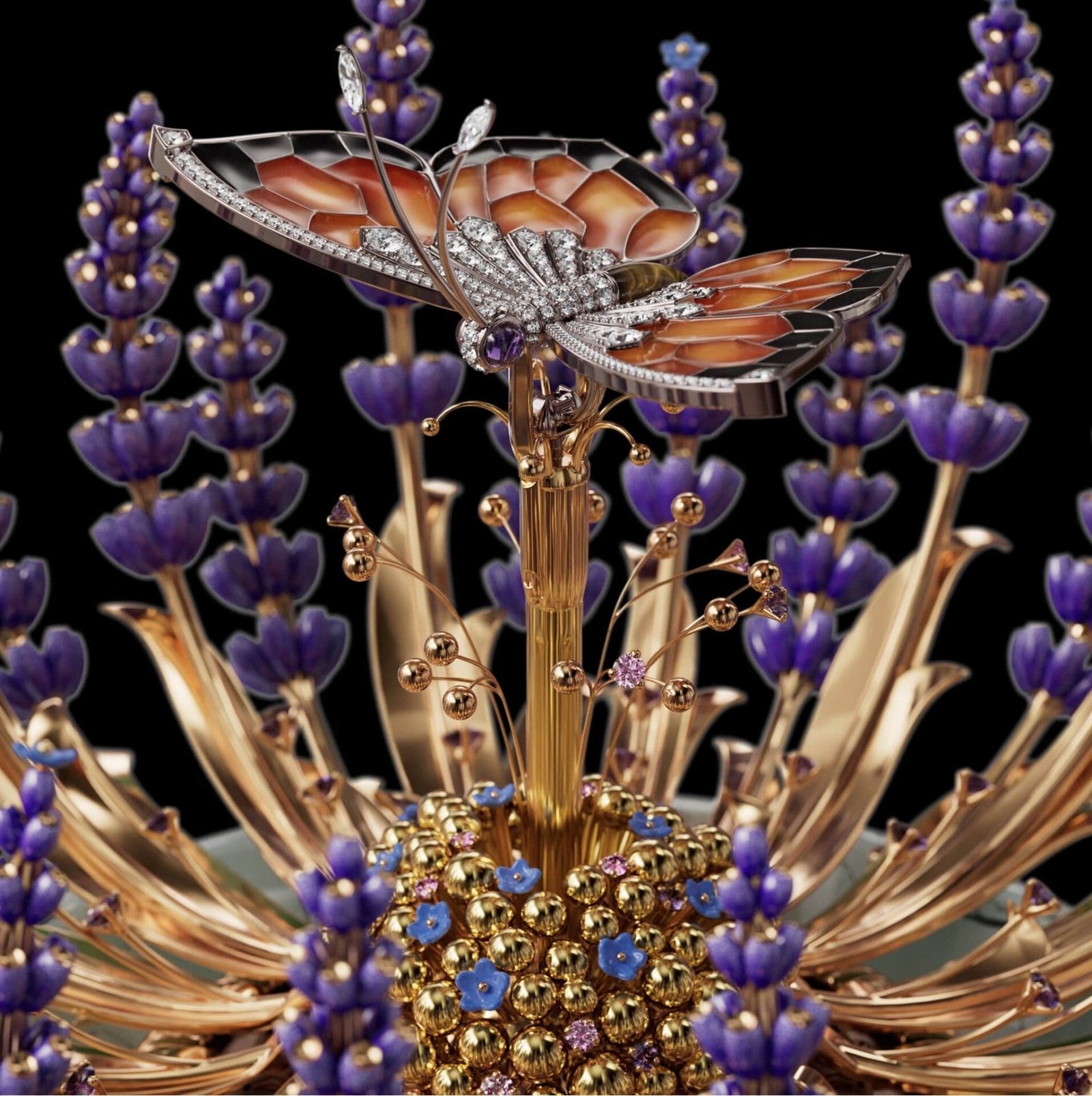 Curling into a dome of lacquered rose gold, the lavender sprigs form a sculptural bouquet that conceals a secret at its heart. Thirty-six stems arranged in two fluid layers intertwine like a living botanical sculpture, painted in harmony with soft green leaves and delicate blue blossoms. When activated, the automaton gently unfurls — as if stirred by a breeze over a Provençal field — revealing a butterfly poised for flight. The transformation is slow, deliberate, and deeply theatrical, echoing the Maison’s gift for turning mechanics into emotion.