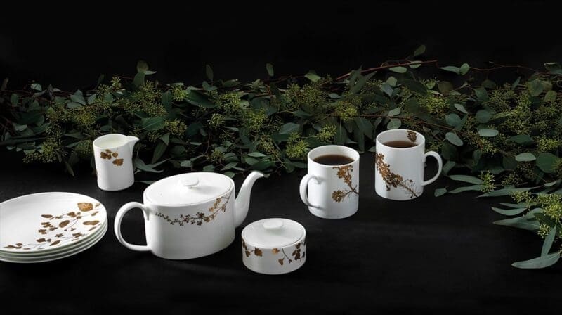 The patterns are inspired by Vera’s love affair with nature and flora, in this case, the lush surroundings and fragrant botanicals of the gardens of the temples at West Lake in Hangzhou, China. They coalesce with Vera’s pen and ink oxalis drawings featuring fine gold tendrils, bronze petals, and shimmering leaves. These original prints compliment the table on fine white bone china, all designed to infuse positive energy into the home.