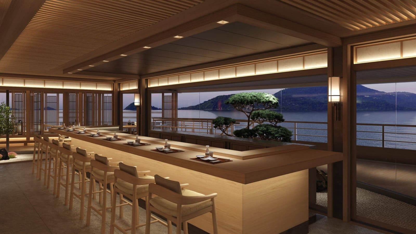 The interiors draw subtle inspiration from the restrained elegance of a Japanese ryokan, shaping an atmosphere that feels composed and deeply restorative. Full-height windows dissolve the boundary between inside and out, while the pared-back material palette reflects Aman’s signature calm. Despite its scale, the yacht maintains an intimate, almost residential feeling, where guests move through spaces unhurriedly and without intrusion.