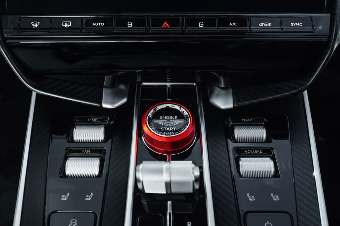 Inside, the cabin reverses the exterior’s dynamism into a calm, light-filled space. Glacier White leather paired with gloss black carbon fibre detailing sets a serene tone, punctuated by pale blue contrast stitching in a bespoke wave motif on headrests and sill plaques. Aston Martin Wings are embroidered into the shoulder bolsters, while a red anodized start/stop rotary subtly recalls the exterior’s coastal accents.