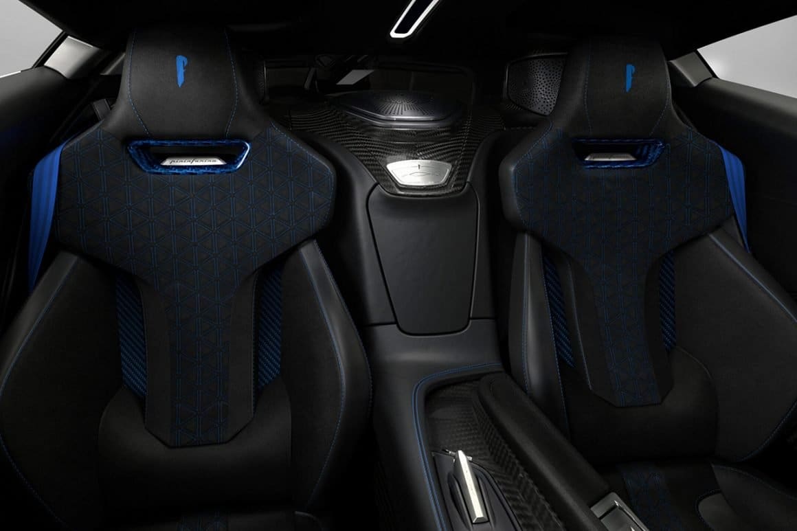 Battista Anniversario is also equipped with the ‘Furiosa’ package, now available to specify with any Battista, comprising a revised carbon fibre front splitter, side blades and rear diffuser. Exclusively on the Anniversario, these parts are finished in a two-tone combination of exposed signature carbon and carbon tinted in Iconica Blu with pin stripes in Bianco Sestriere. Besides the exclusive livery, a bespoke rear wing, rear aero fins and other bespoke details are unique to the Battista Anniversario. The aerodynamic enhancements enabled by the Furiosa exterior changes deliver increased downforce and greater stability at higher cornering speeds and a more dynamic balance to the car.