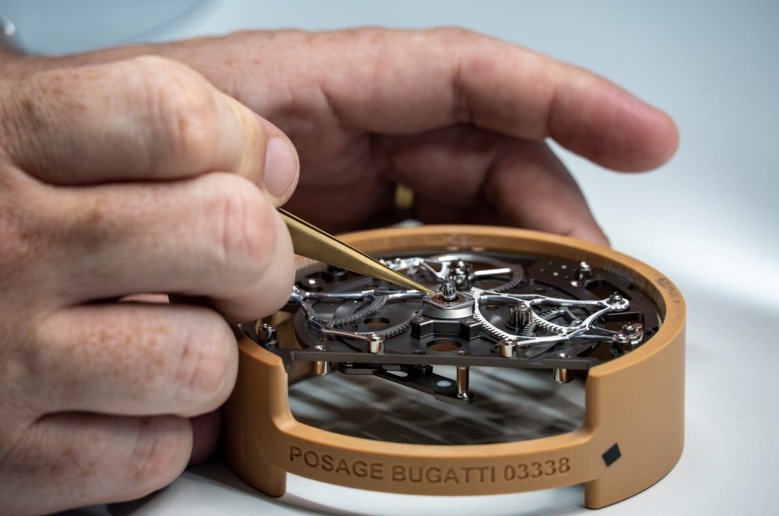 Clients may select decorative finishes such as Clous de Paris, radial guilloché, tapestry and engine-turned motifs that reference Bugatti’s heritage. Highly exclusive materials, including Aventurine and gem-set accents, further elevate the instrument module. Functional rubies serve as bearing jewels to reduce friction within the mechanical structures, while sapphire crystal and skeletonised elements reinforce the horological character.