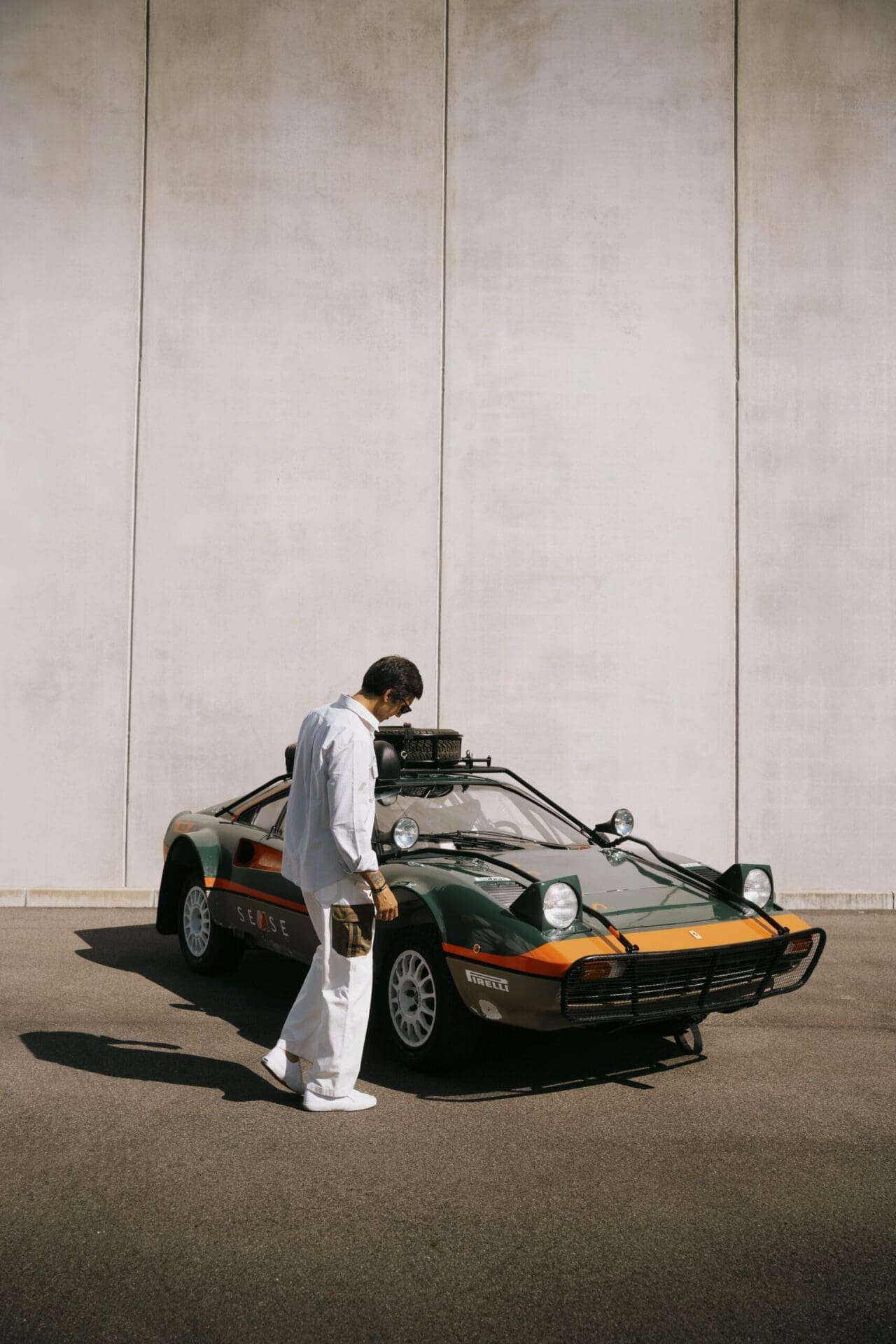 The collaboration materialises most visibly in the rally livery: a striking fusion of heritage and innovation. On Automobili Amos’ signature dark green base, vivid orange accents energise the Ferrari’s form, while desert-toned panels nod to Solaro fabric—an iconic textile known for reflecting sunlight, historically tied to British military tailoring and reimagined by SEASE in its collections. Completing the design is the hybrid logo SEAASE, symbolising the union of carmaker and clothier in this pursuit of endurance and style.