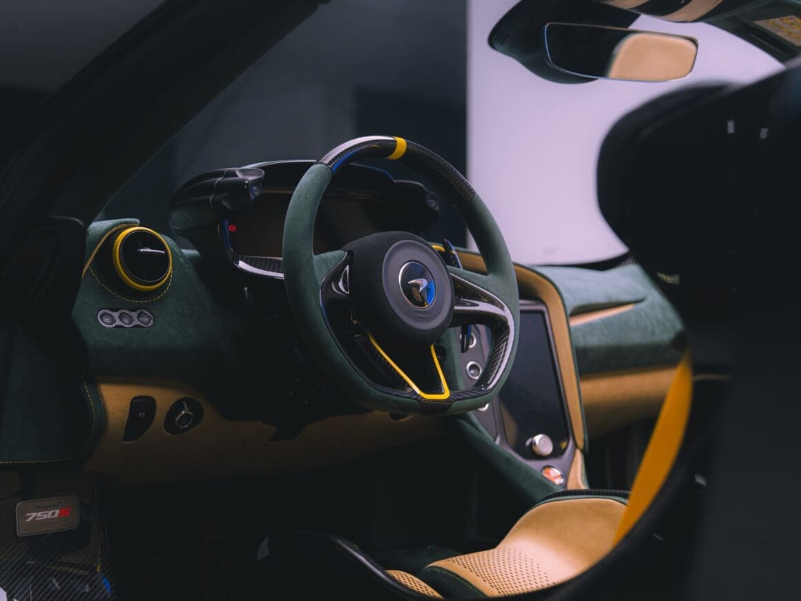 Inside, a green and tan colour scheme channels the spirit of classic British racing aesthetics. Racing seats styled after those found in the McLaren Senna add a motorsport edge, while custom signature details further personalise the cockpit. The result is a blend of tribute and intent—a 750S that recognises the past while embracing the present.