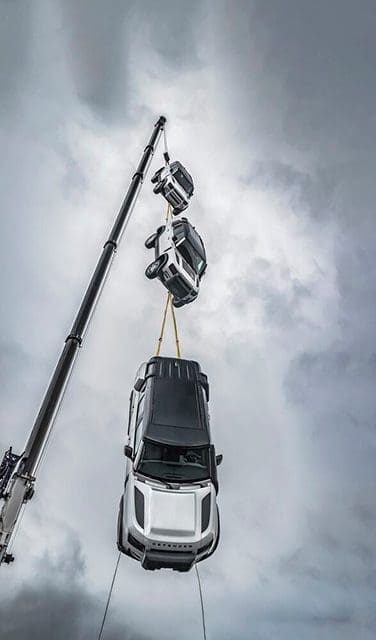 To celebrate the achievement, Land Rover teamed up with Top Gear magazine to prove that the New Defender is worthy of the ‘Unstoppable Force’ title. The ultimate strength test was designed to prove-out the structural toughness of the Defender’s D7x aluminium platform by suspending three un-modified 110s from a crane solely through their towing eyes.