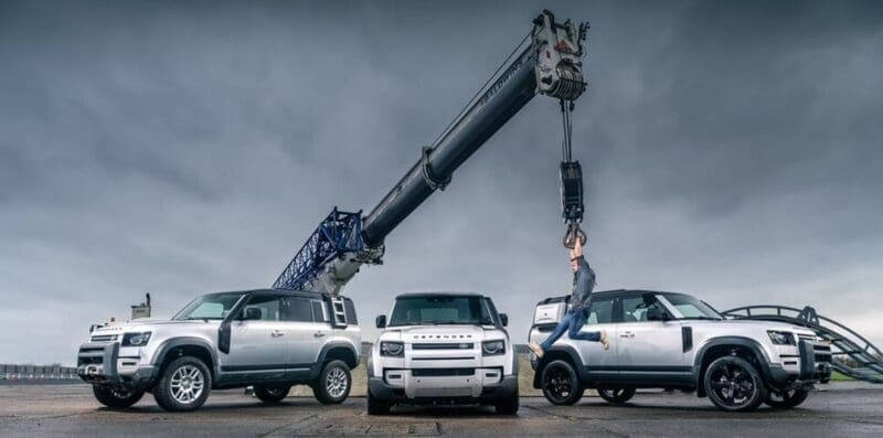 Top Gear’s Tom Ford said: “We wanted to prove that Land Rover’s New Defender really does live up to the hype and had to test it in typical Top Gear fashion. What better way to let me loose with a 150-tonne crane, three Defenders and a rope?”