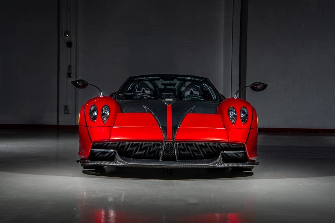 One of 100 produced, the Pagani Huayra Roadster pairs sculptural design with AMG-built twin-turbo V-12 performance delivering 754 horsepower and 738 lb-ft. Roadster #39, finished in Rosso Dubai with exposed carbon fiber, shows 312 miles.
