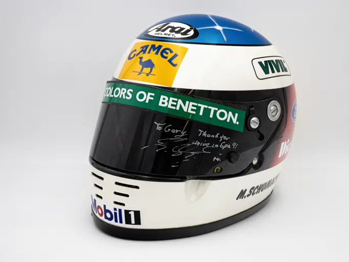The auction also boasts an exquisite lineup of motorsport timepieces with storied provenance. Jean Todt’s personal 1993 Girard-Perregaux Automatic Chronograph prototype (est. €20,000–€30,000) and a Cartier Ferrari watch once gifted to Gianni Agnelli by Enzo Ferrari (est. €10,000–€20,000) underscore the luxury-meets-legacy appeal of this collection. Helmets worn by Schumacher across various seasons, including his 2005 Schuberth RF1 and a 1991 Arai from his Benetton debut, sit alongside modern collectibles such as a 2022 Charles Leclerc promotional helmet.