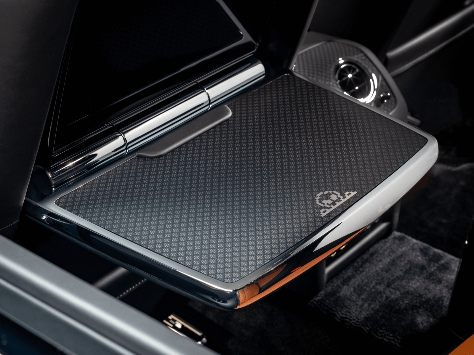 Inside, the atmosphere shifts from homage to fully immersive universe. The Black and Casden Tan interior suite is layered with hidden stories, textures, and gaming references, each crafted to reward the curious. Embroidered “Player 1” and “Player 2” front seats set the tone with a visual language reminiscent of retro arcades, while headrests display pixelated aliens in vibrant arcade-era hues. The meticulous stitching and technical fibre finishes echo the tactile thrill of early gaming spaces.
