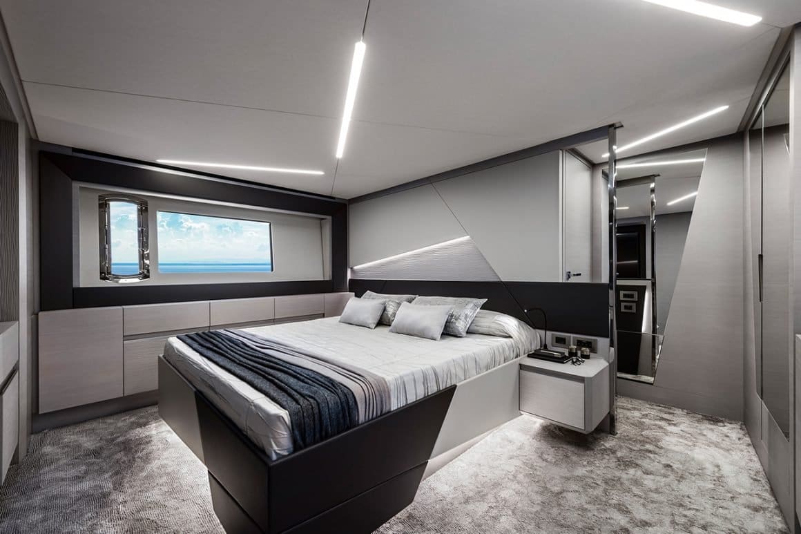 An important new stylistic feature has been introduced for the first time on the Pershing 7X: new portholes in the cabins, which let go of the typical elliptical shape to make room for much larger square and rectangular shapes. These can now be fully opened inwards, flooding the rooms with air and natural light, and giving the feeling of having a real window in the cabin.
