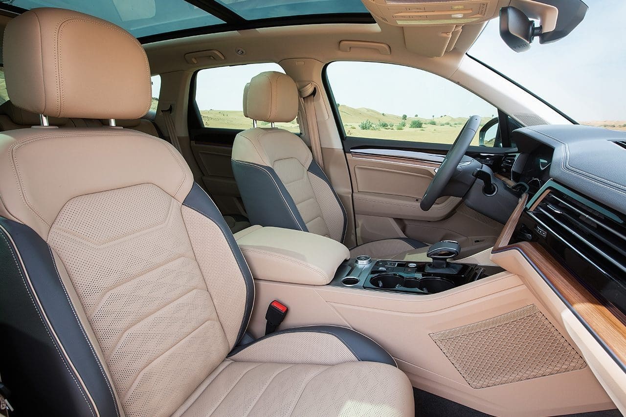 The new Touareg is available in R-Line trim across the region. The R-Line trim offers exclusive sport styling and premium features, such as Comfort seats in Savona Carbon with stitching in contrasting colour on the front and rear, and R-Line logo on the front backrests; R-specific aluminum inlay; central console in high glossy black; R-Line logo on the welcome screen; Sports pedals in stainless steel including footrest; R-specific leather multifunction steering wheel with R-Line logo; Armrest, steering wheel and selector lever with stitching in contrasting colour; Door sill trims with R-Line logo in the front which is illuminated in combination with ambient lighting; Fabric floor mats front and rear with border in contrasting colour