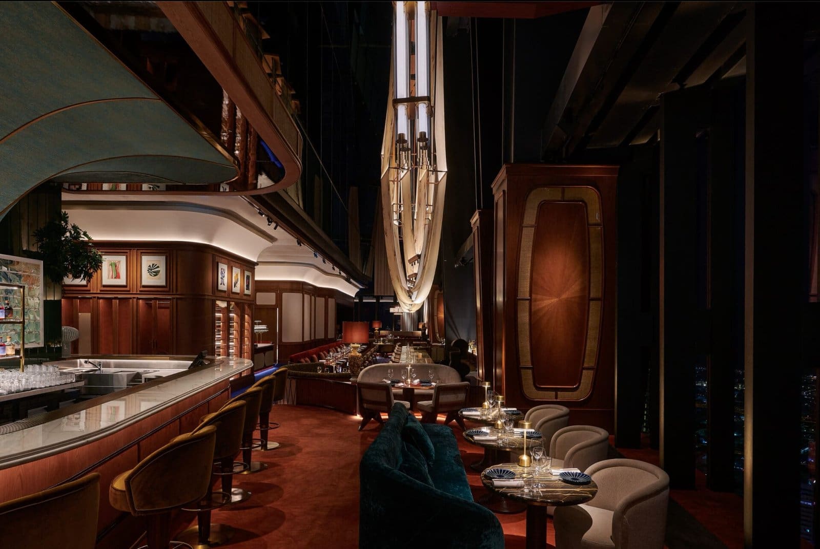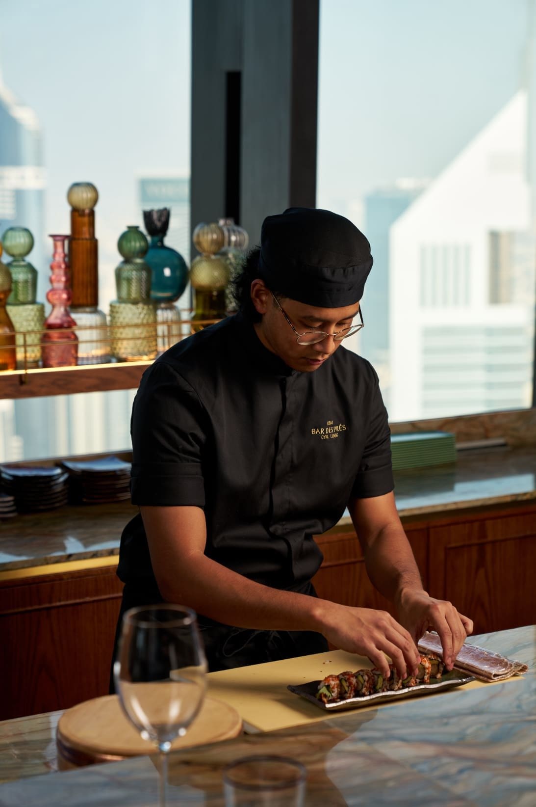 The interior, curated by award-winning studio Lázaro Rosa-Violán, carries the refined DNA of its Parisian origin while fully embracing its new context. Mustard-hued marble tables and peacock-embroidered upholstery whisper of European glamour, while bamboo, rattan, and copper nod subtly to Eastern minimalism. The result is a space that is both grounded and elevated, where every design choice mirrors the duality of the cuisine—refined yet bold, classic yet daring.