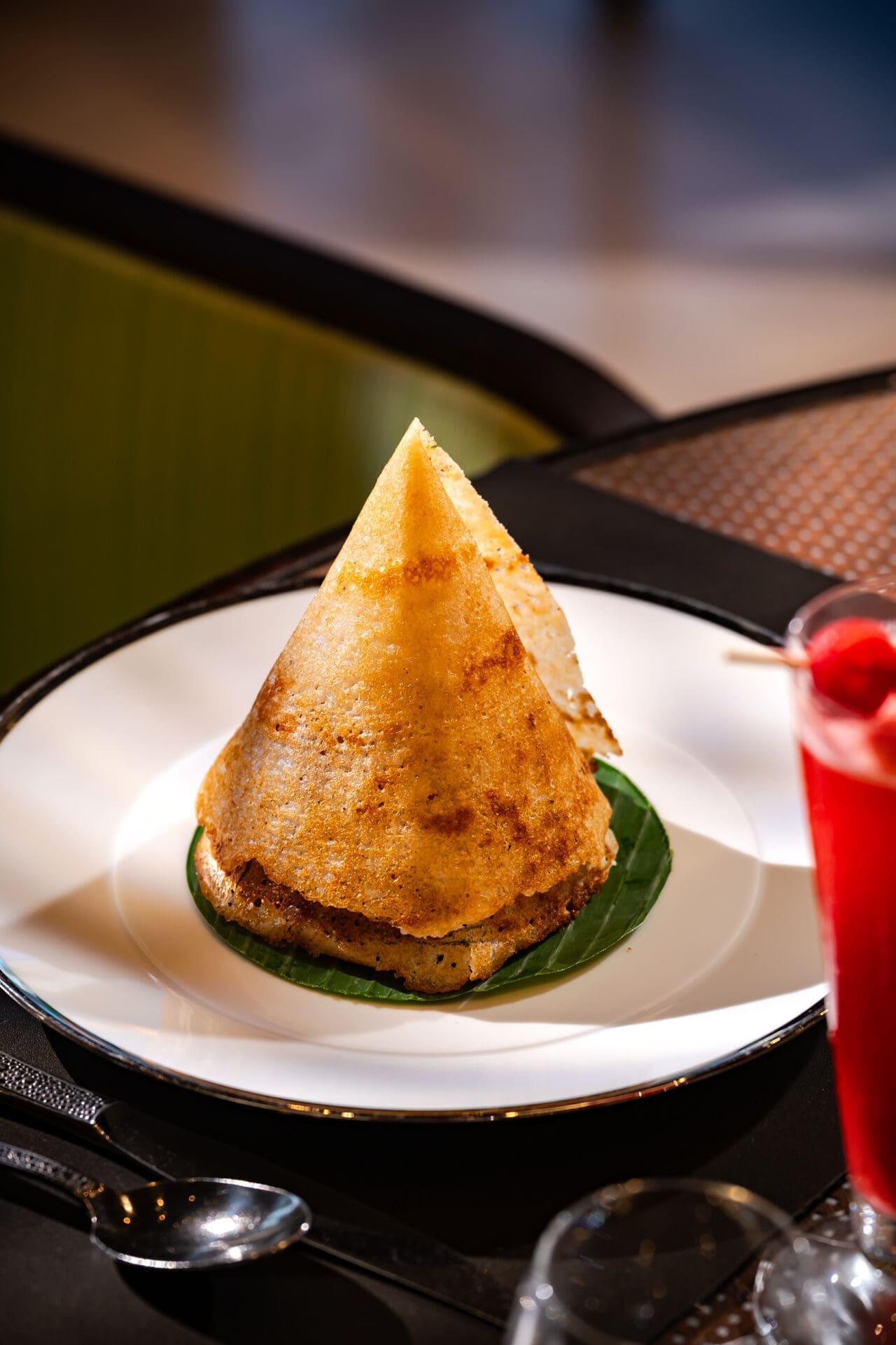 For mains, the menu presents regional delicacies like Kori Gassi, a Mangalorean-style chicken curry brimming with coconut and dry chillies; Andhra Fish Curry, where sea bass is gently poached in a tangy raw mango broth; and Lamb Pepper Fry, bold and spicy, served alongside crispy dosa and coconut chutney. Vegetarian delights such as Broccolini & Asparagus Poriyal and a comforting Sambhar round out the mains, offering balance and contrast.