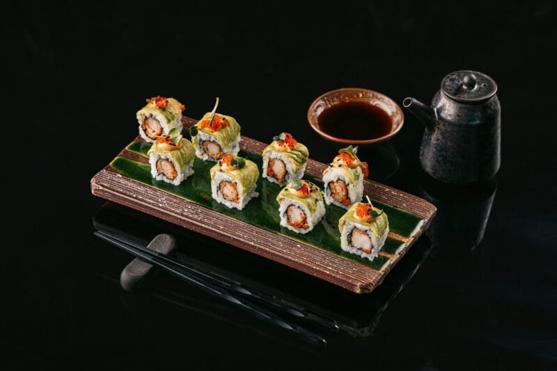 The experience begins lightly, with tender Edamame and Baby Spinach dressed in a delicate Yuzu-Miso, before the table fills with the vibrant colours of a Sushi Signature Platter. Tuna, salmon, and yellowtail sashimi are paired with rolls such as California, Spicy Sake, and Goma Dragon, each piece designed as much for its artistry as for its taste.