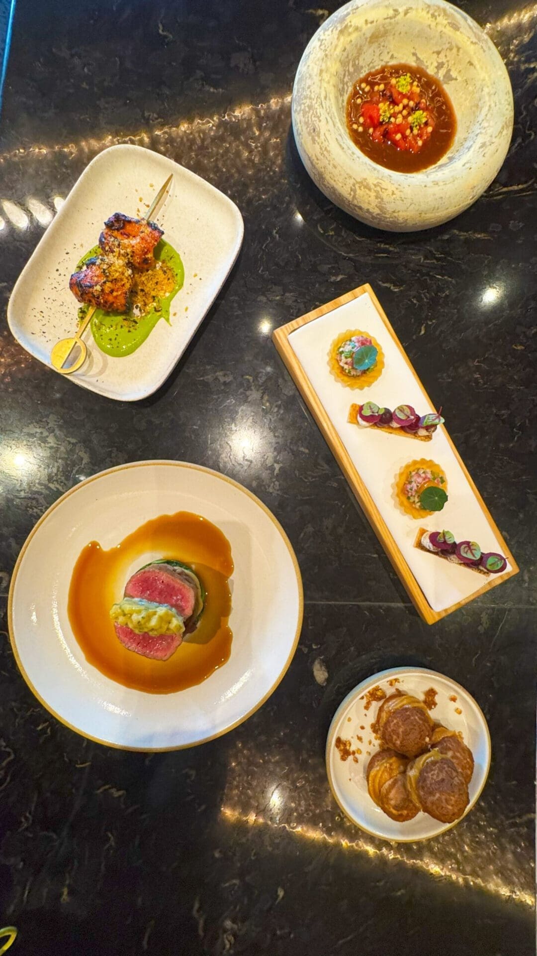 The season begins with Revolver x Burnt Butter, a one-night collaboration that unites Joshi with Emirati chef Khaled, founder of Burnt Butter. For AED 395, diners will embark on an eight-course journey that pivots from tenderloin hummus topped with nduja butter to Scottish langoustine kissed by coconut and coriander, before climaxing with black Angus rib glazed in spicy soy. The finale? Churros dipped in karak chocolate sauce — a playful nod to local taste with a decadent twist.