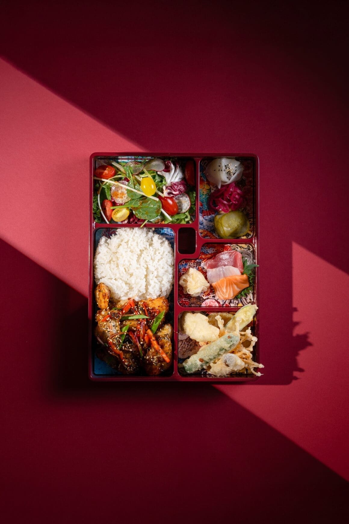The Bento Box includes a sashimi selection, Japanese pickles, assorted tempura, green salad with wafu dressing and steamed rice. Guests then choose a main: Chicken Katsu Curry, Crispy Sweet and Sour Eggplant, or Stir-Fried Yakiniku Beef Short Ribs.