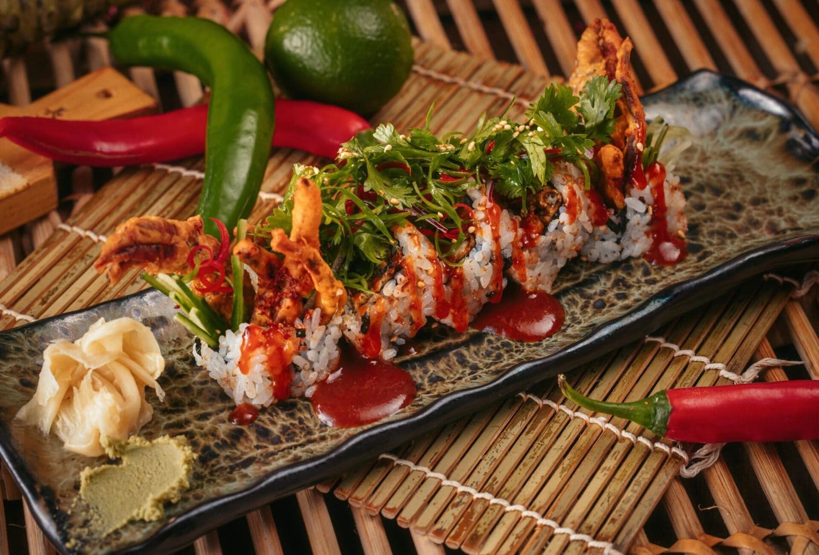 - From Asia: Inspired by Singapore, the Chili Crab Roll (AED 105) features soft-shell crab tempura elevated with sweet chili sauce and yuzu mayo.