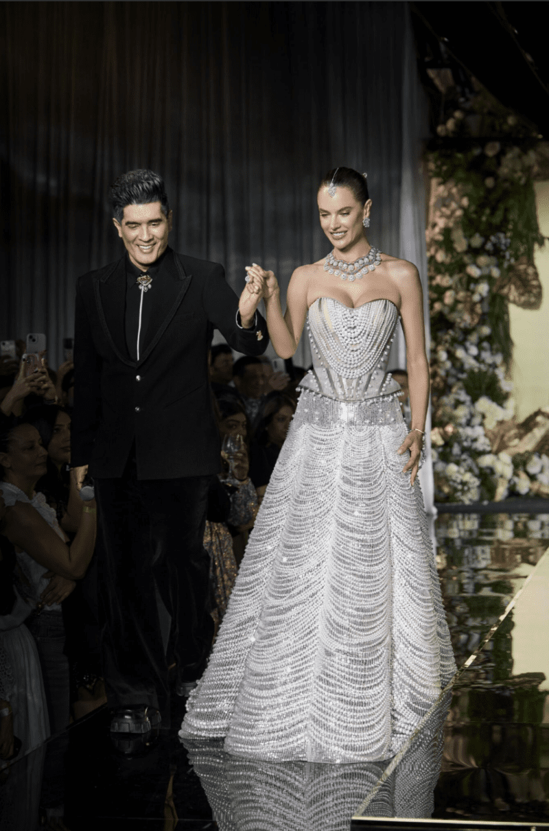 The evening reached its crescendo with the debut of global fashion icon Alessandra Ambrosio, making her first appearance in an Indian couture presentation. As the official muse, she wore two breathtaking looks: The Lady Crystal Diamond, a dazzling draped ensemble of crystal embroidery, and The Pearl Story, a sculptural vision of layered tulle and cascading pearls. Her presence sealed the night’s global significance and reasserted Malhotra’s role as a cross-cultural fashion force.