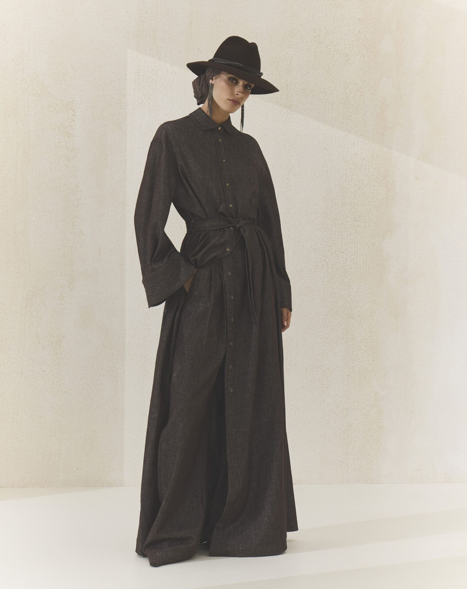 The colour palette echoes the collection’s introspective mood. Natural tones of sand, stone, cocoa, and cloud establish a calm foundation, punctuated by deeper shades such as burgundy and slate. These hues enhance the emotional resonance of the garments, offering versatility for both day and evening settings.