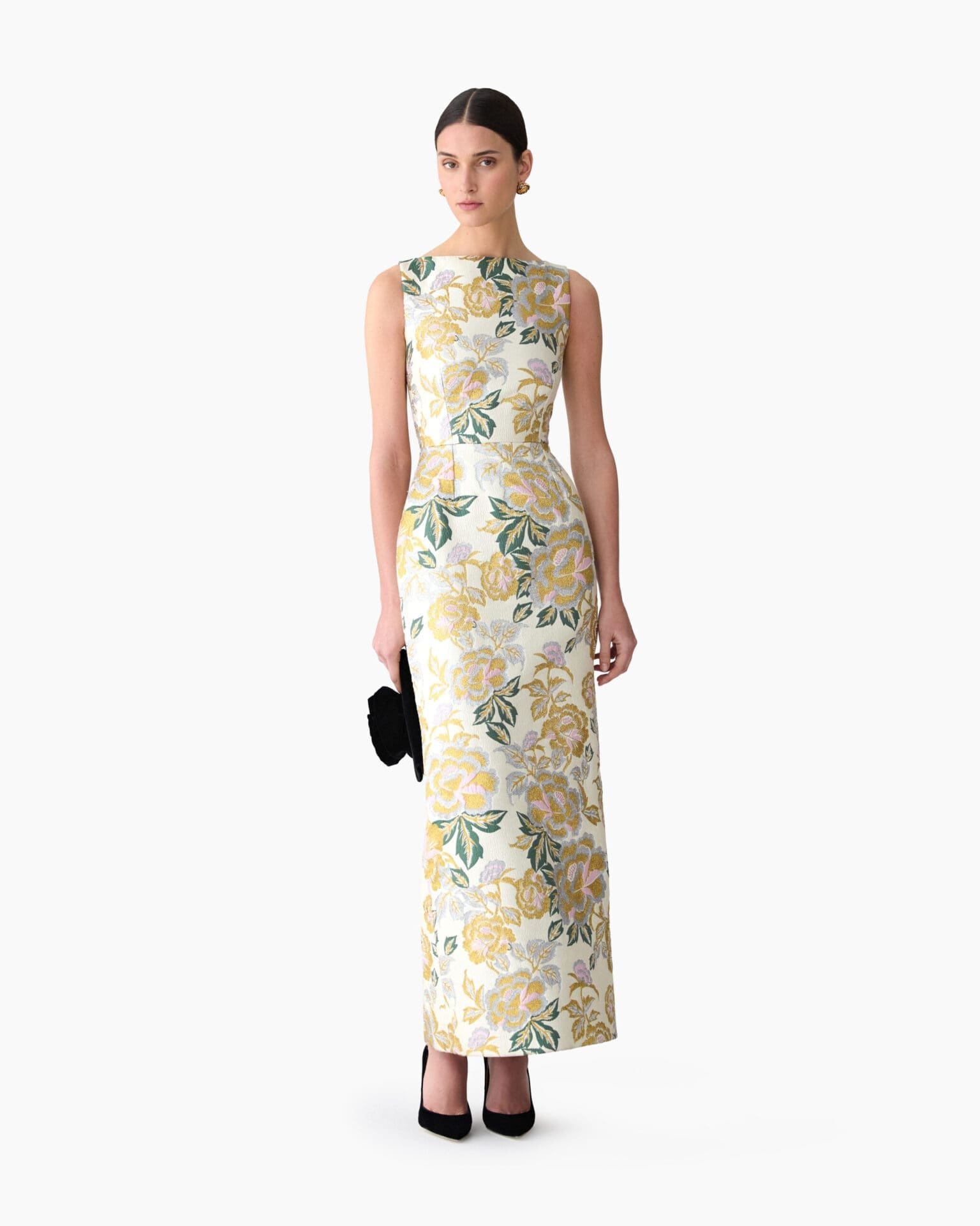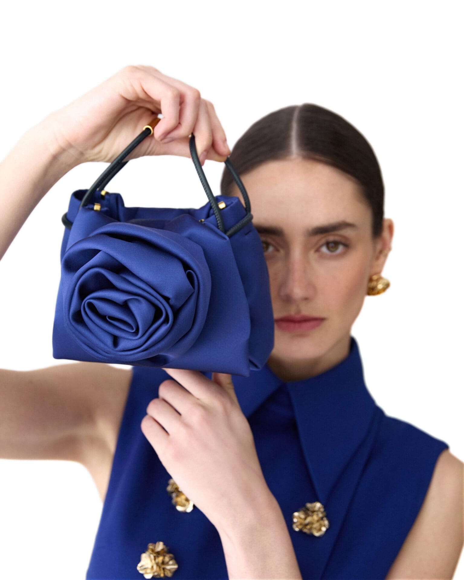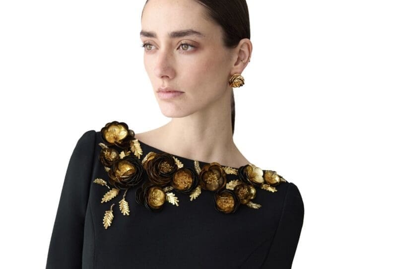 On the runway, florals took on new life. A jacquard in floral lurex unfurled across a column gown and tailored pencil skirts, capturing the play of light like petals after rain. Silk rosettes — each petal handmade — blossomed on hips, on strapless bustiers, and on voluminous skirts, lending the collection a romantic sculptural dimension. There was nothing haphazard here; every bloom was planted with intention.