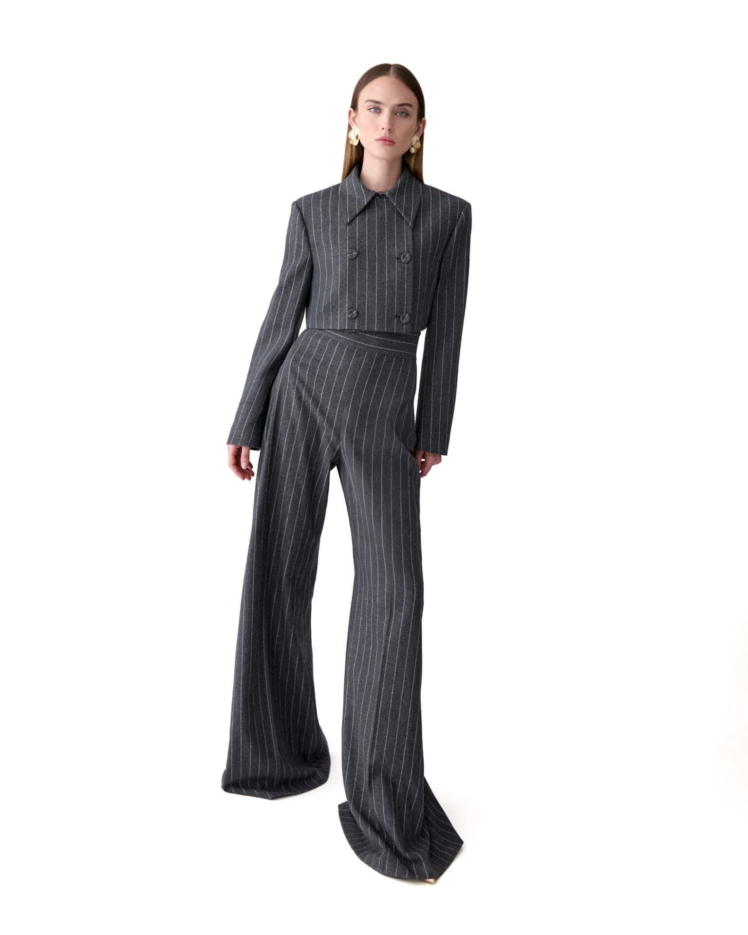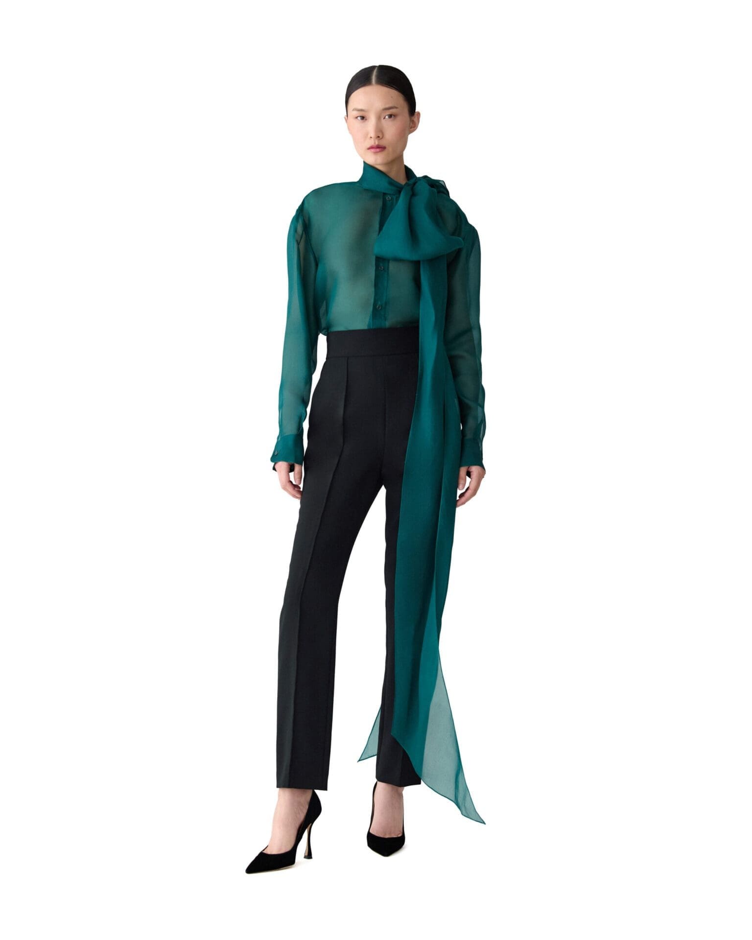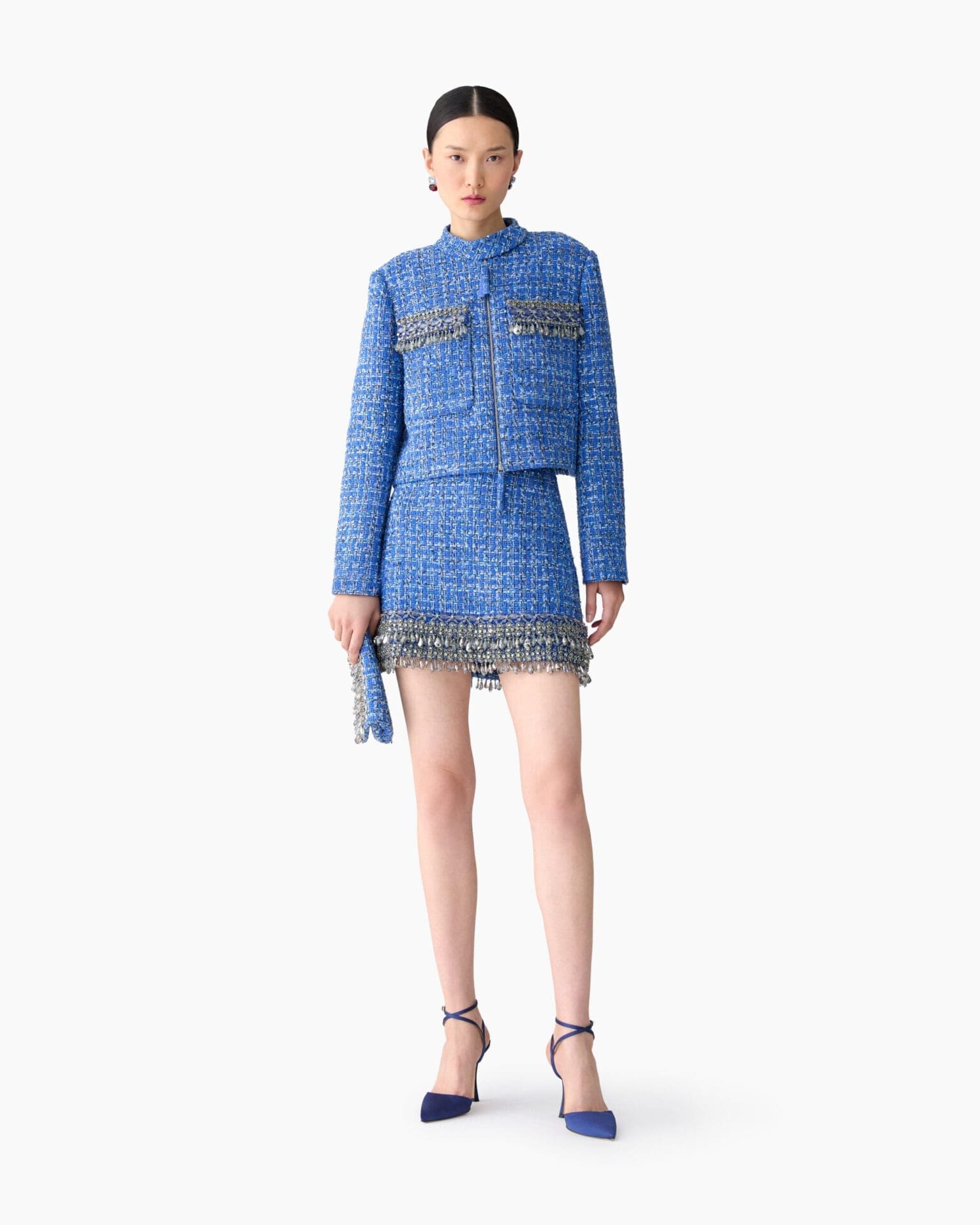 On the runway, florals took on new life. A jacquard in floral lurex unfurled across a column gown and tailored pencil skirts, capturing the play of light like petals after rain. Silk rosettes — each petal handmade — blossomed on hips, on strapless bustiers, and on voluminous skirts, lending the collection a romantic sculptural dimension. There was nothing haphazard here; every bloom was planted with intention.