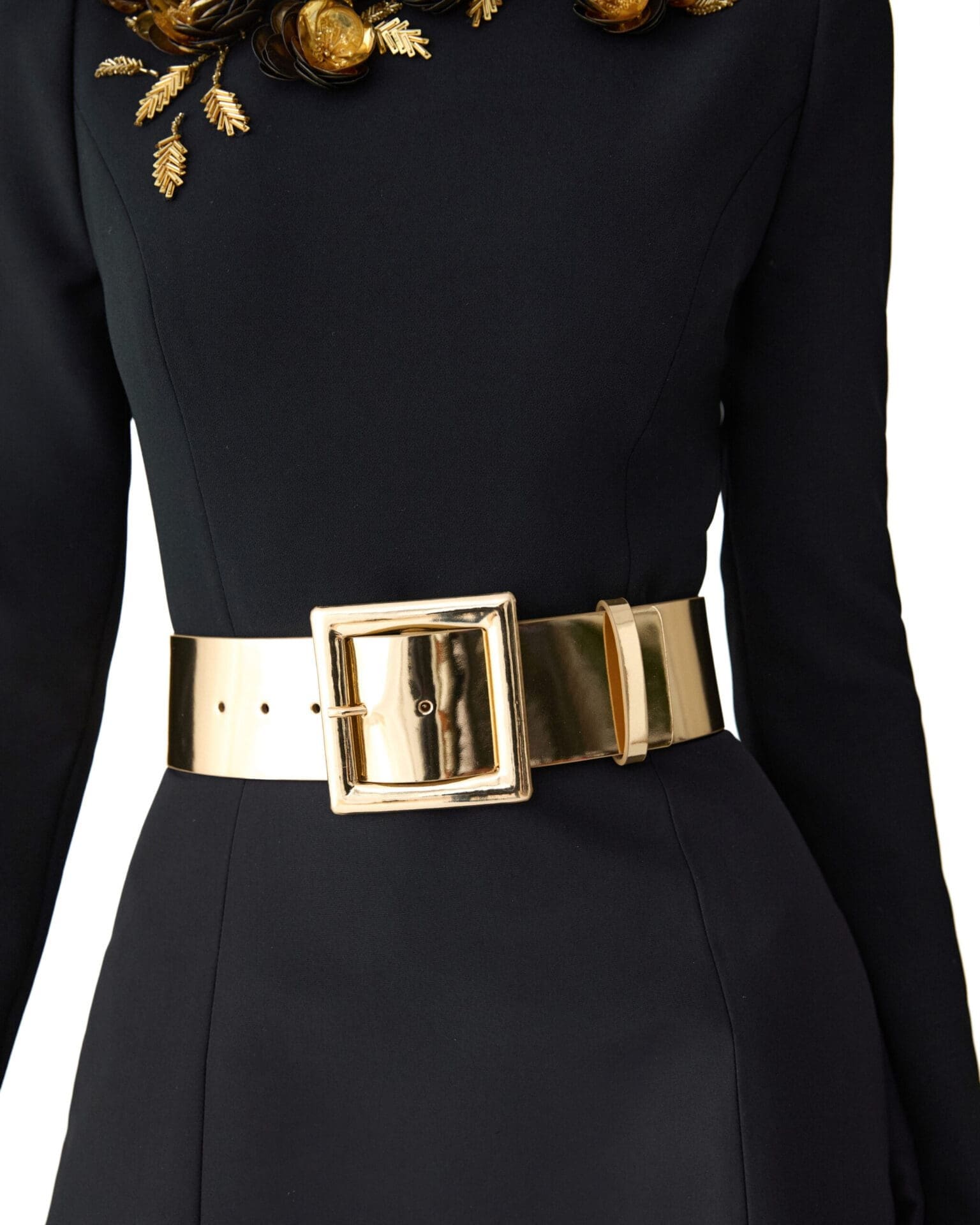 Embroidery elevated the narrative further. A glittering tulip motif, crafted in bullion gold, adorned coats and gowns that shimmered with both grandeur and restraint. These pieces, though dramatic, never veered into excess — they carried the poise of Herrera’s codes, balancing theatrical presence with a distilled elegance that has always defined the house.