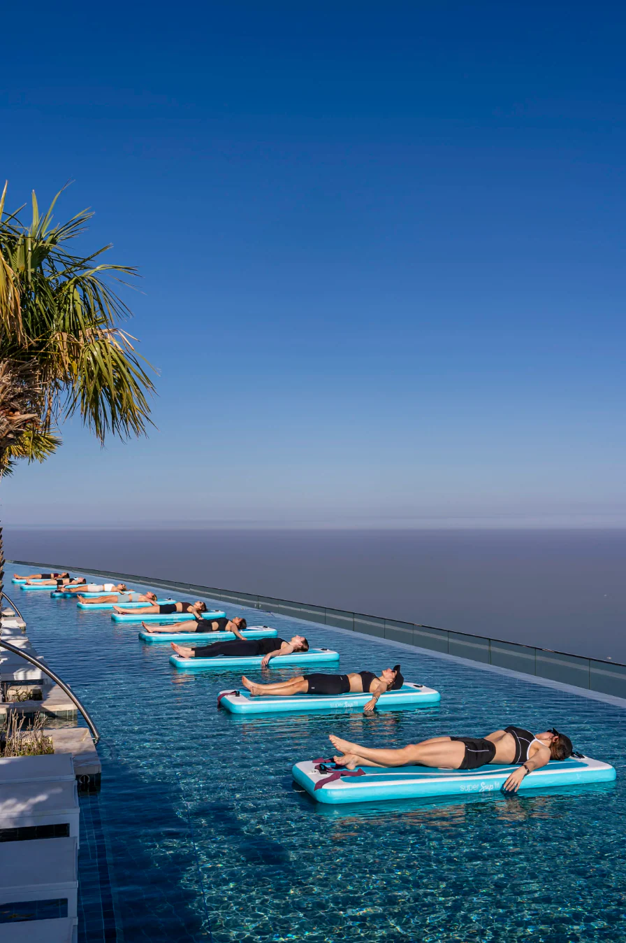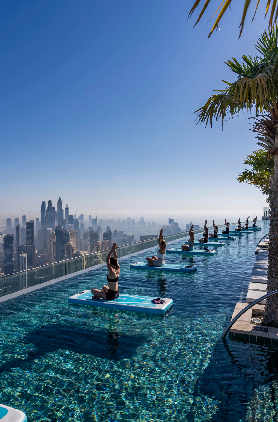 Set high above the city at Zeta Seventy Seven, the experience unfolds within one of Dubai’s most striking sunlit settings. Floating boards rest on still water, framed by endless sky and skyline. The environment alone encourages presence and focus. Movement begins before the workout even starts.
