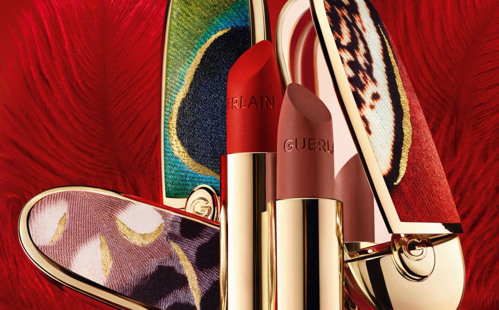 The highlight of the collection is Rouge G Prestige, an exceptional lipstick case created in collaboration with Parisian embroidery duo Baqué Molinié. Embroidered with a feather motif of golden chains and glowing red beads, the case epitomises couture craftsmanship. Paired with three classic Rouge G shades, it stands as a true collector’s item.