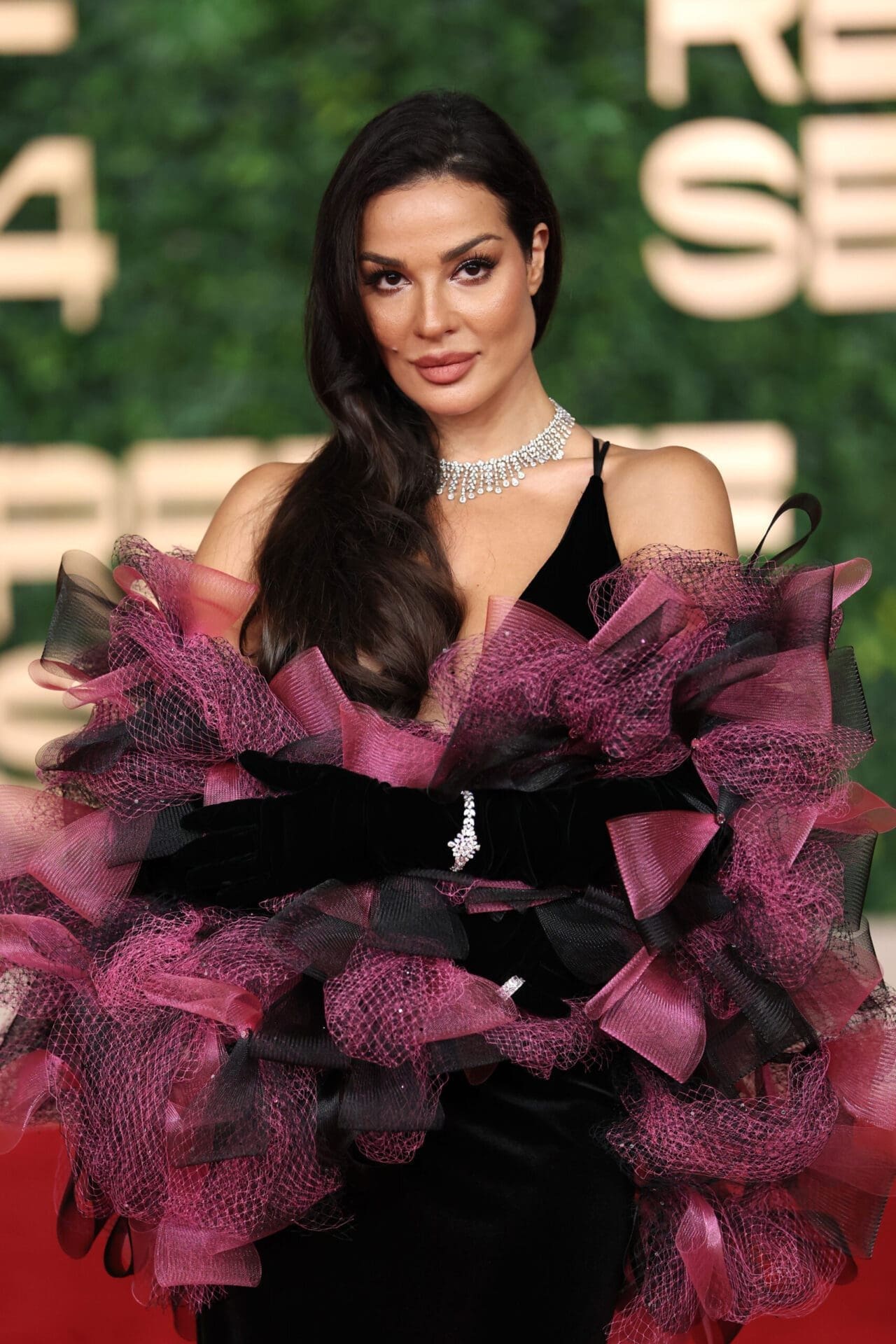 Nadine Njeim radiated elegance in a necklace featuring 3.91 carats of pear-shaped diamonds and 20.03 carats of round-shaped diamonds, complemented by a bracelet showcasing 6.74 carats of diamonds, all from Chopard’s Haute Joaillerie collection.