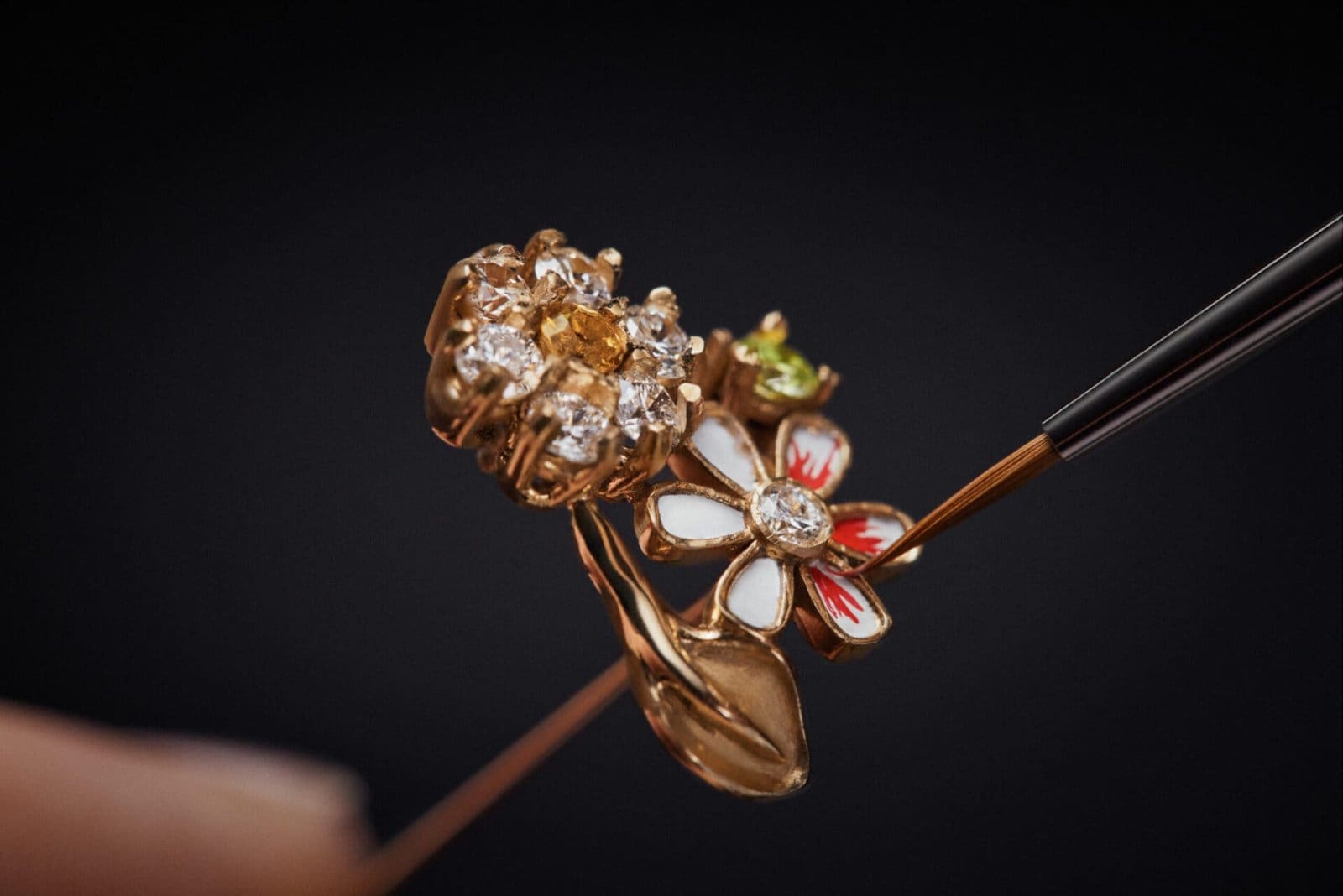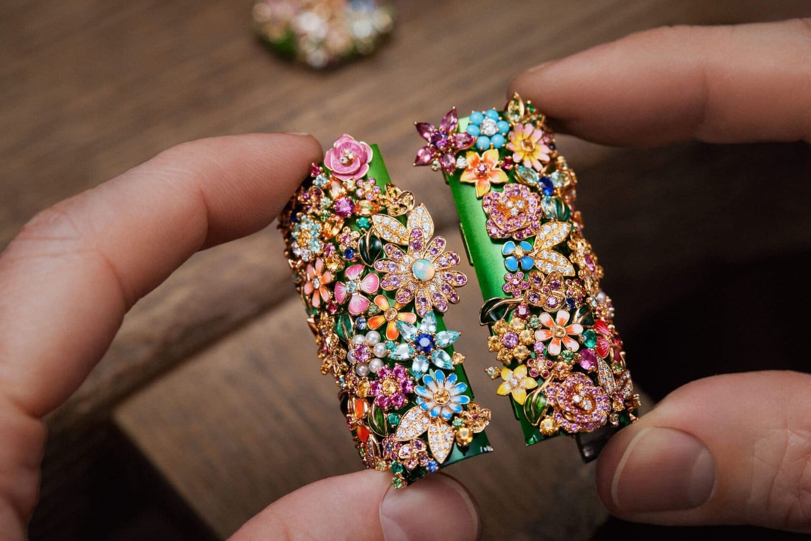 Inspired by the natural world—a shared passion between Victoire de Castellane and Christian Dior—the case blooms into a miniature spring garden. This jeweled Eden is alive with flowers, insects, and delicate creatures, meticulously sculpted and set with precious stones in shimmering hues. Paraiba tourmalines, turquoises, and opals play in luminous contrast, each facet reflecting the artistry of Dior’s master goldsmiths.