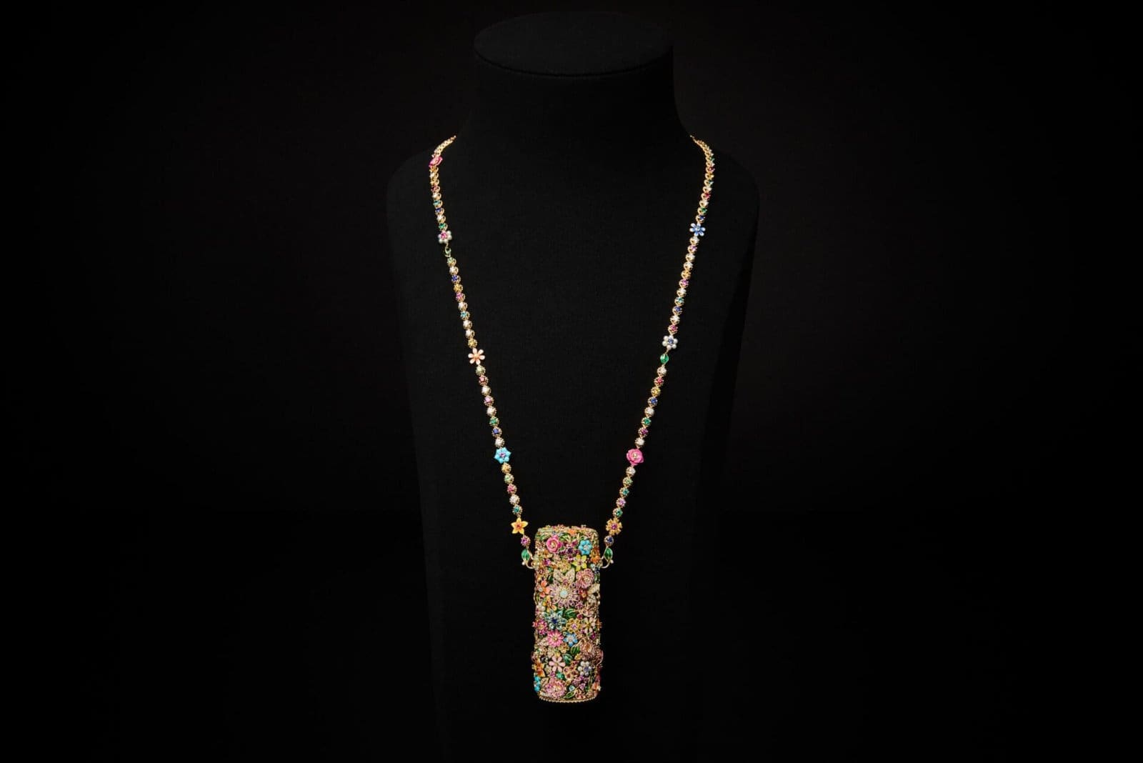 Beyond its beauty, this creation hides a secret: its transformation into a necklace. A delicate gold chain, adorned with motifs from the Mimirose line and sprinkled with colourful flowers, allows the Rouge Premier to be worn close to the heart. In this way, it becomes a jewel not just for the vanity but for the body—a talisman of elegance and self-expression.