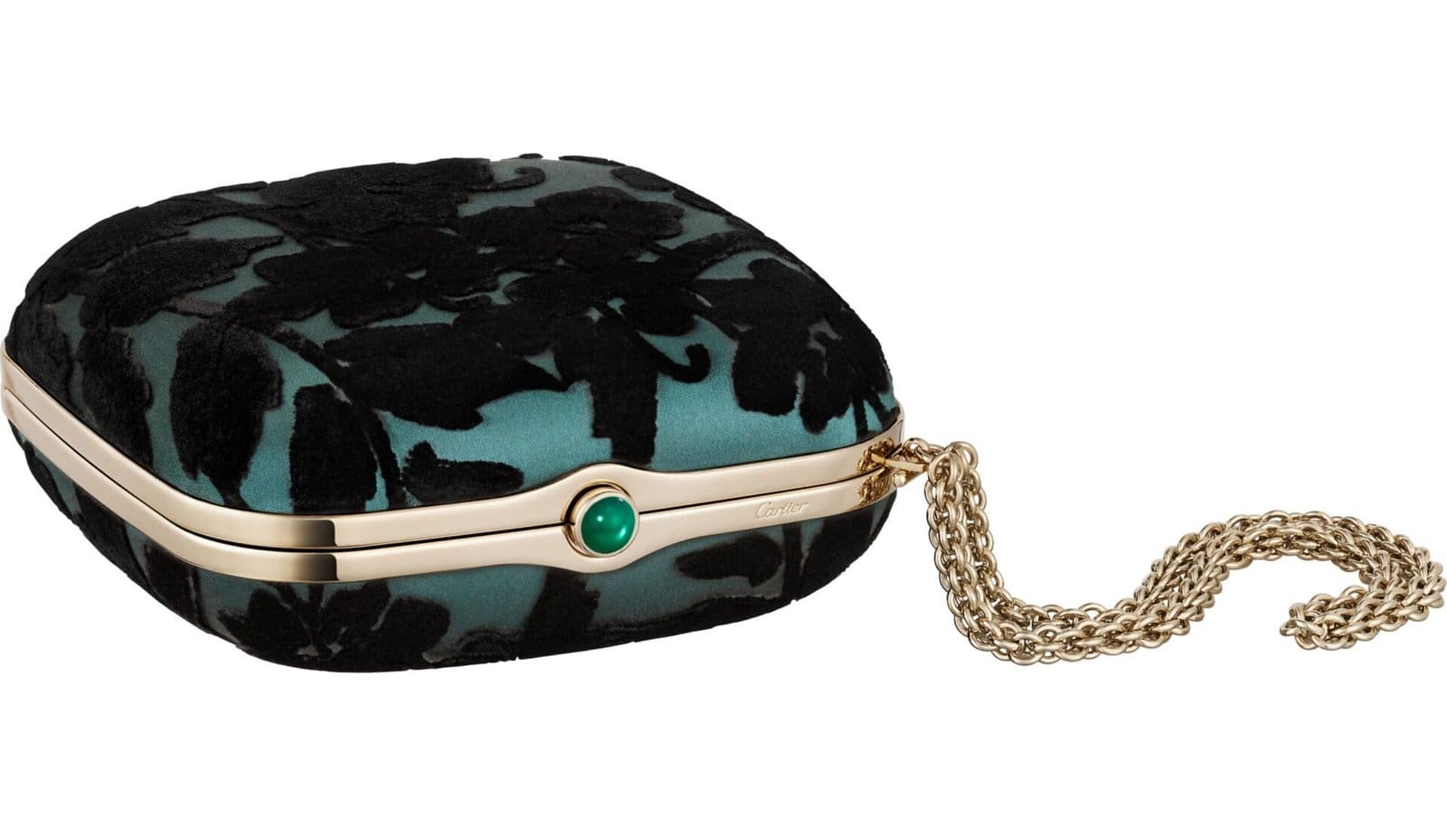 A palette of couture materials elevates the tactile appeal of each creation. Velvet-effect satin, suede-lined calfskin, and intricate crochet knitwork are meticulously combined with Cartier’s signature savoir-faire. The black floral tufting on emerald green satin, for example, demands exceptional technical skill, with artisans manually cutting embroidery loops to achieve a lush, velvet-like surface—a technique reminiscent of haute couture embroidery.