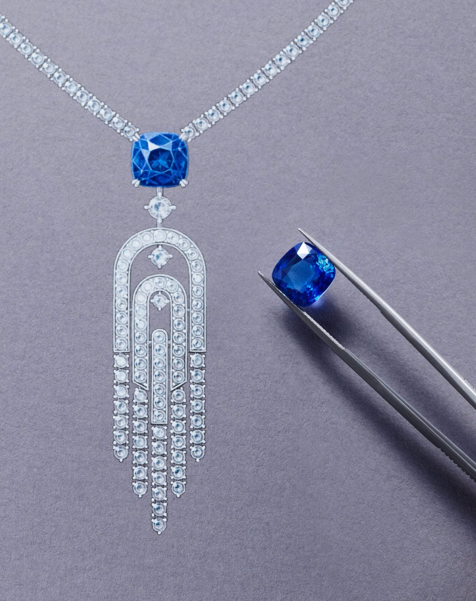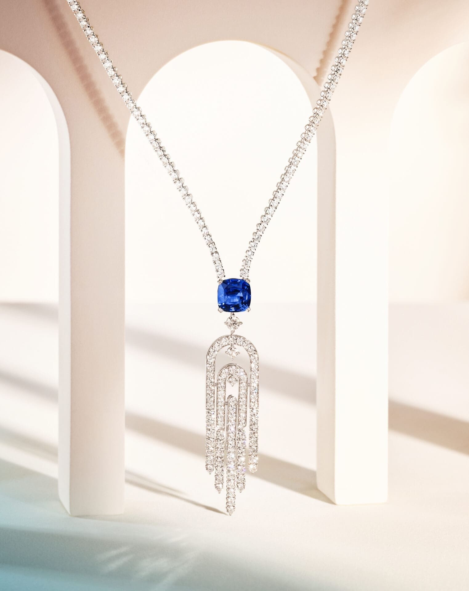 Sapphires from Sri Lanka, with their royal blue intensity, define the second set. A 7.13-carat cushion-cut stone anchors a supple diamond necklace, while a matching ring and earrings showcase over 6 carats of brilliance. The fluidity of the articulated design mirrors flowing arches, marrying structure with movement.