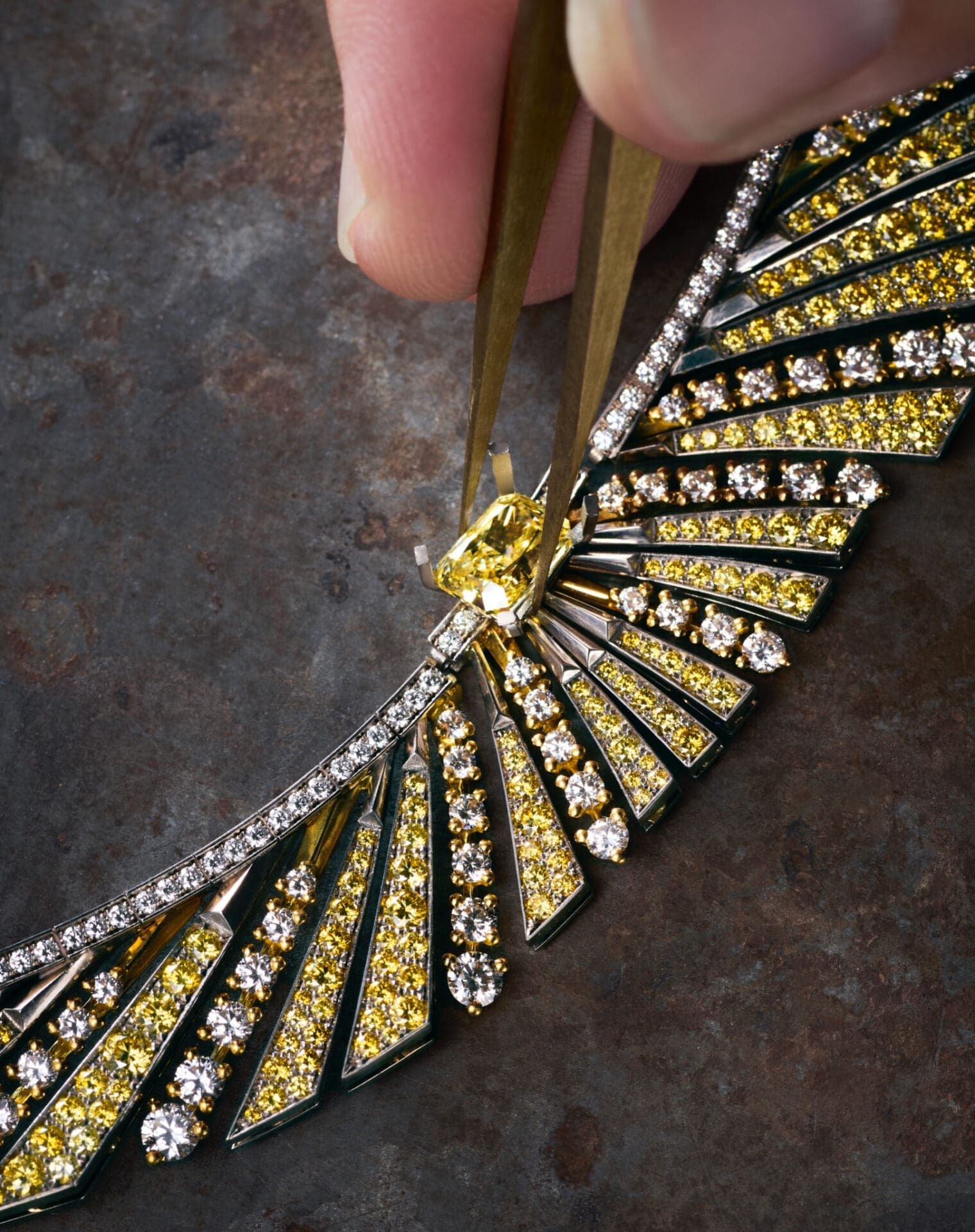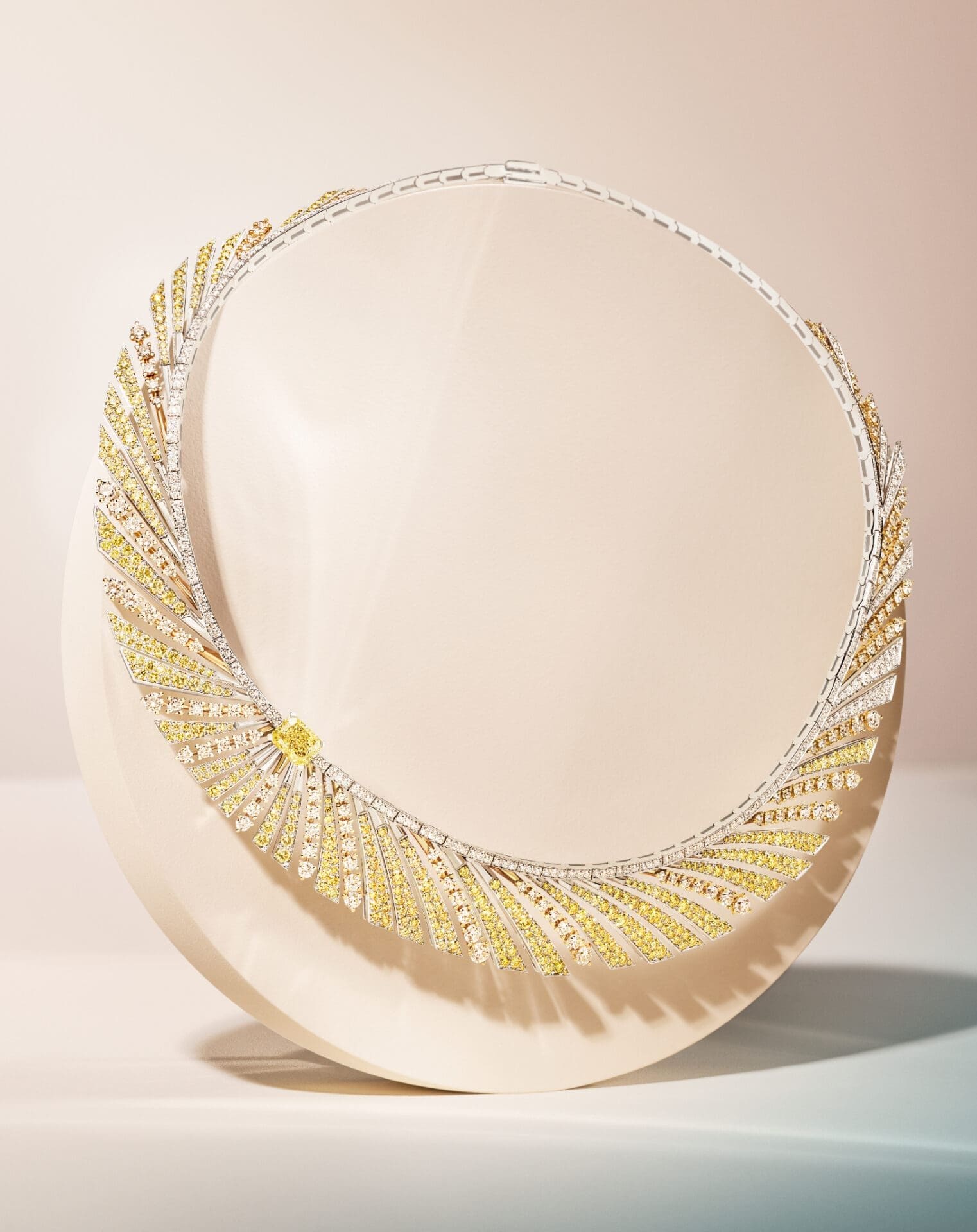 If 1936 evokes the Maison’s birth, the chapter Soleil d’Or Sunrise captures its solar spirit. Inspired by the legendary 100-carat yellow diamond acquired in 1977, the collection draws on the shifting light of dawn and the brilliance of the sun at its zenith. Strands of yellow and white diamonds drape like sunbeams across the skin, their shimmer changing with every movement.