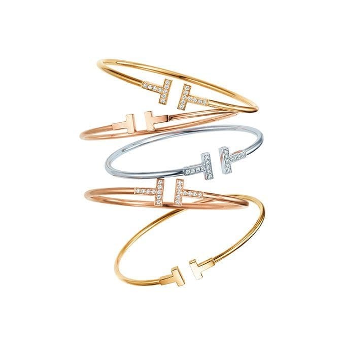 1.  Tiffany T bracelets (from top): Tiffany T Wire Bracelet with Diamonds in 18 karat yellow gold, Tiffany T Wire Medium Bracelet in 18 karat rose gold, Tiffany T Wire Bracelet with Diamonds in 18 karat white gold, Tiffany T Wire Bracelet with Diamonds in 18 karat rose gold, Tiffany T Narrow Wire Bracelet in 18 karat yellow gold