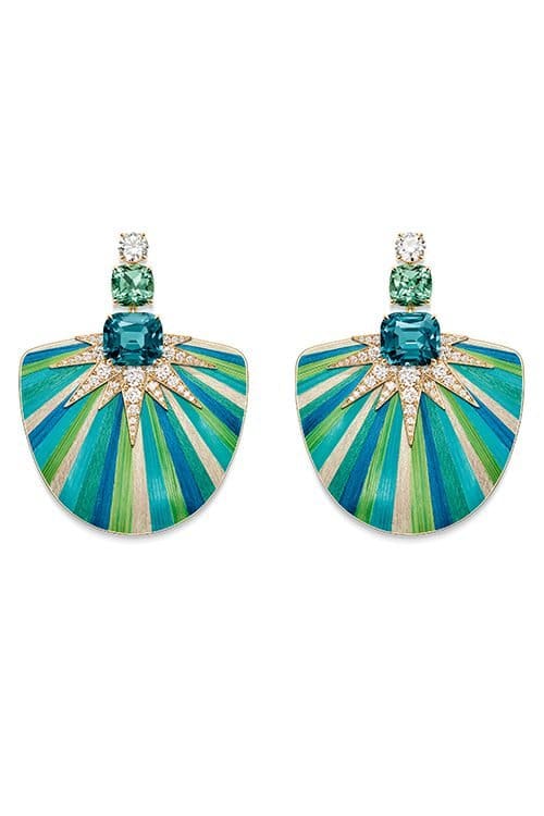 For the first time ever, Maître d’Art Rose Saneuil has worked on three High Jewellery creations. Pushing the limits of creativity, Saneuil has developed a surprising association between straw and wood. More precisely, it is by using fine straw from ryegrass and wood from European hornbeam and sycamore that she has crafted these exquisite marquetry creations. Element by element, each minuscule piece of veneer is carefully cut to exact size before being meticulously positioned to create the whole (G38N9100).